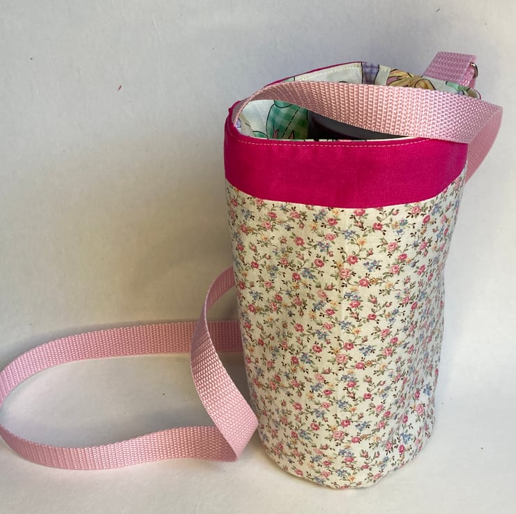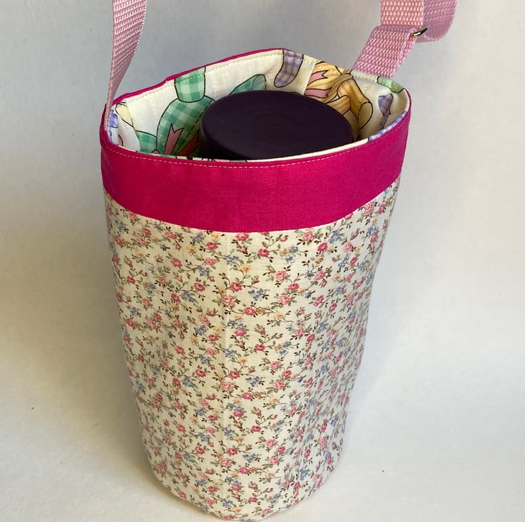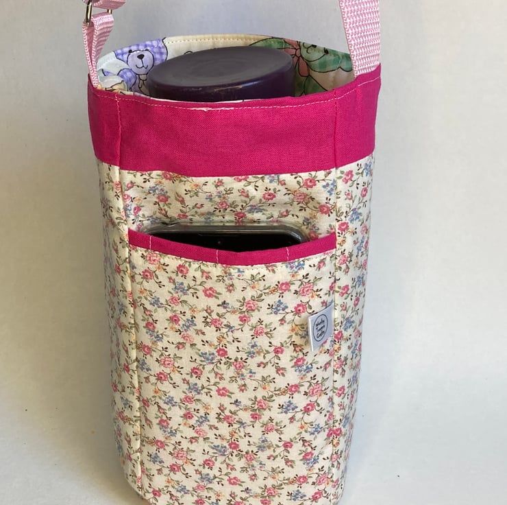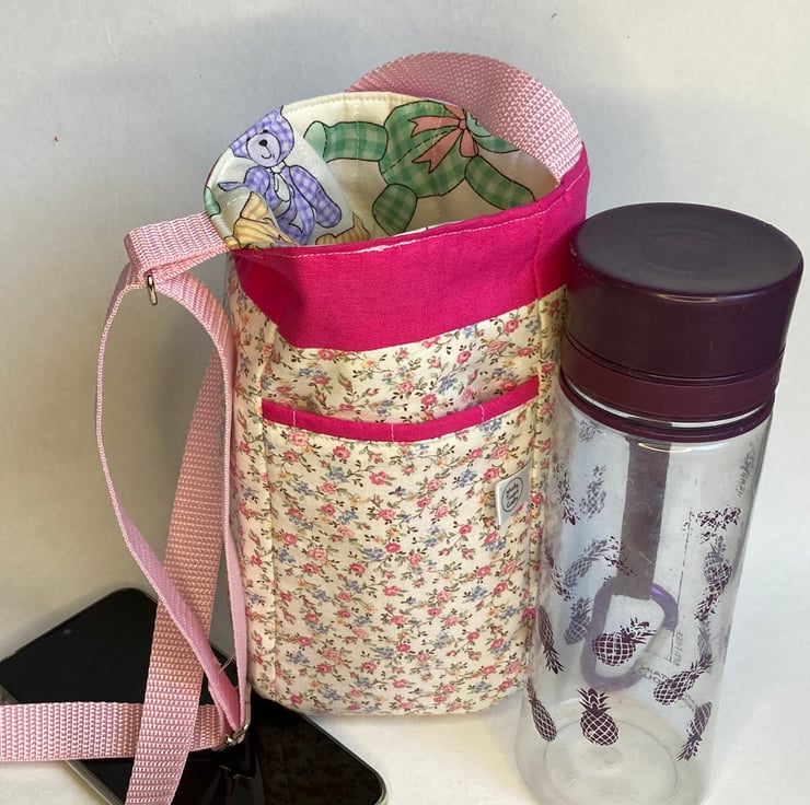 The outside of this bag is made from a pretty, ditsy floral fabric trimmed with bright pink. The lining is decorated with pastel coloured teddies and the strap is pale pink. Laid flat, the bag measures 16cm across and 25cm deep. It will easily transport most drinks bottles or hot drinks cups, but do measure your favourite cup first, just to make sure. The built in pocket, designed to hold your phone, measures 9.5 x16.5cm.