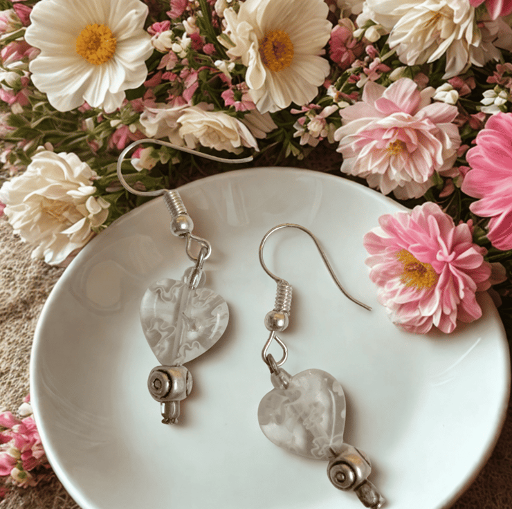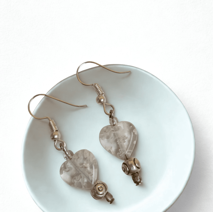 Simple, elegant and lightweight 3 dimensional clear glass hearts. With a cloudy, white floral design running through the glass, these hearts are combined with simple engraved Tibetan silver round orbs and tiny silver coloured beads. Hanging on nickel free, 925 silver hooks.