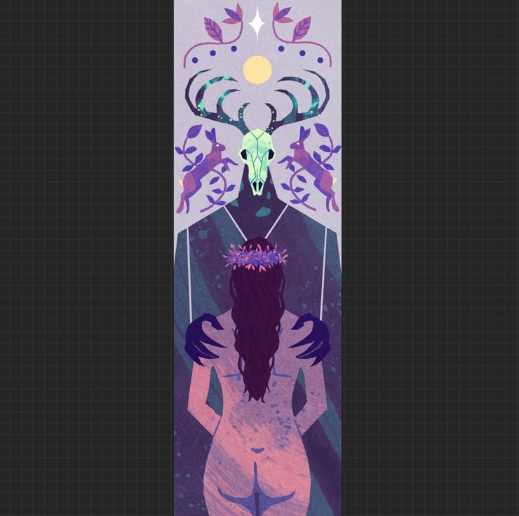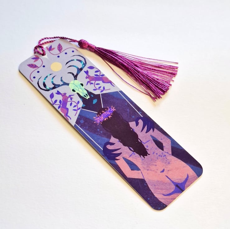Never loose your place in a book again with this beautiful bookmark featuring a storybook illustration created by Kathryn Davies, of a maiden wearing a flower crown paying tribute to a skull headed nature god. Featuring decoration of a full moon, hares and flowers.