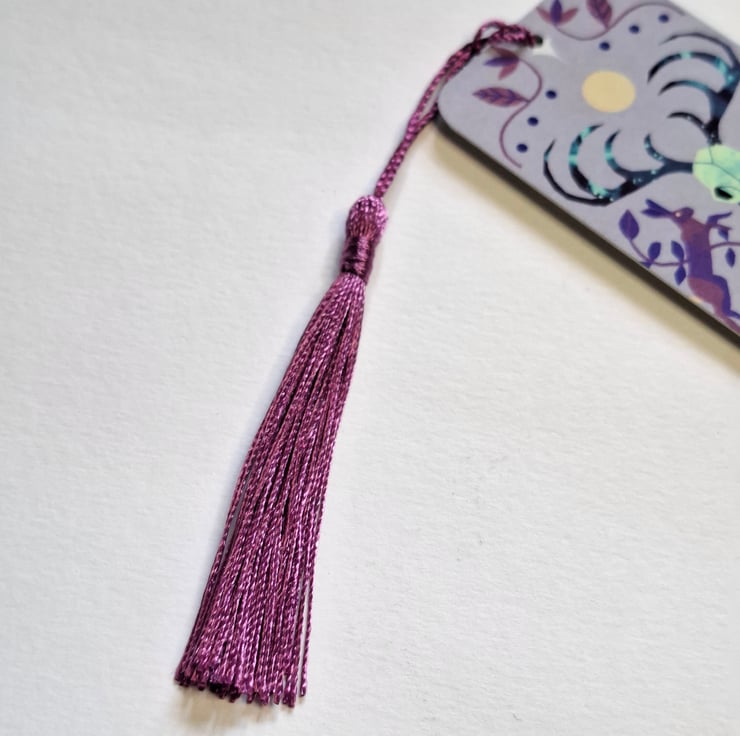 This colourful folk artwork is printed on brushed metal and comes with a matching purple tassel.