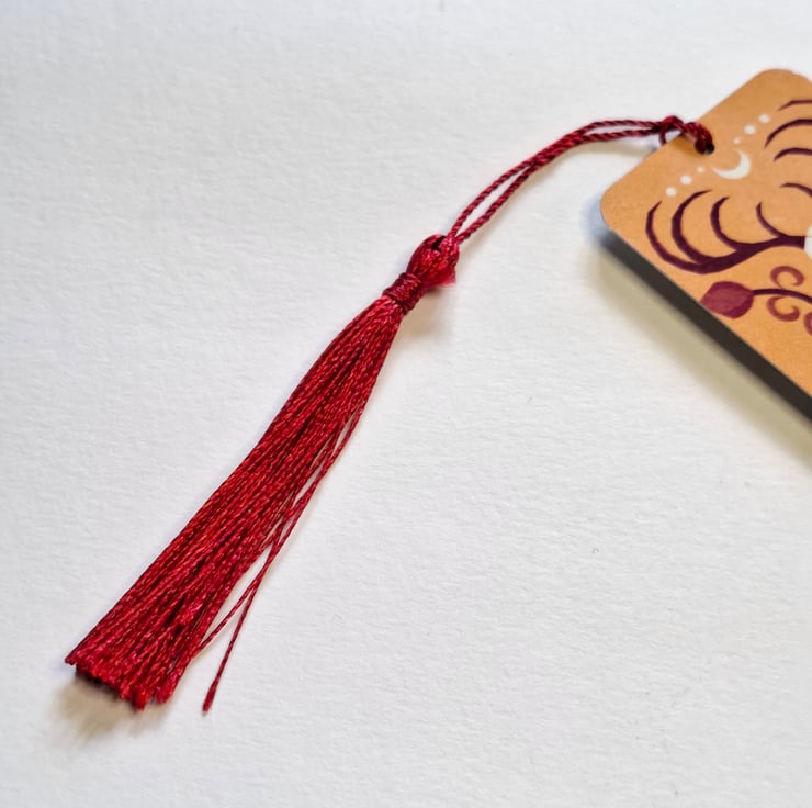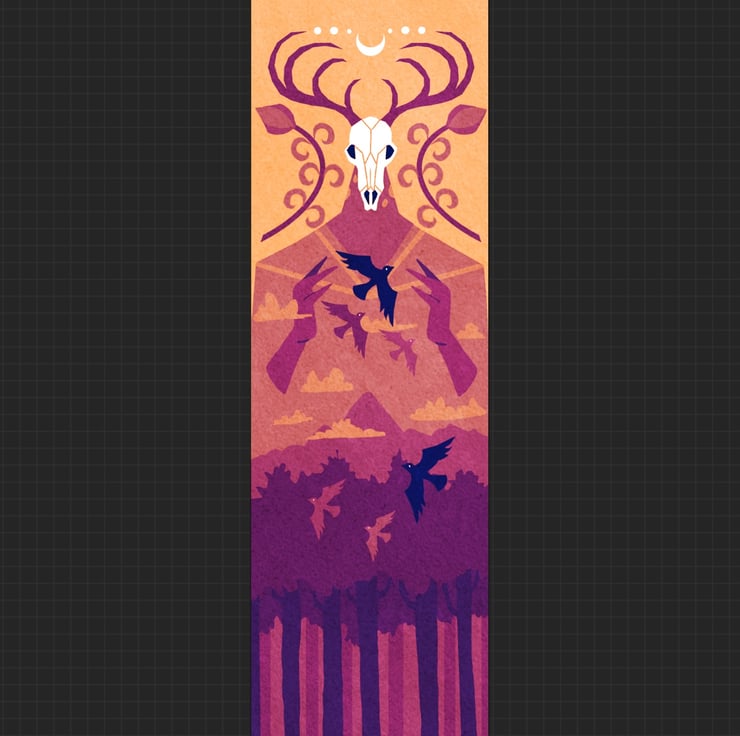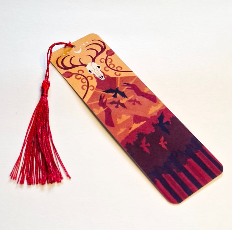 Keep the place in your book safe with this gorgeous, vivid brushed metal bookmark with tassel, featuring folk art by Kathryn Davies of a skull headed nature god. Includes illustrations of mountains, a forest and birds soaring through the sky.