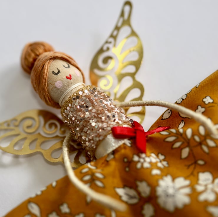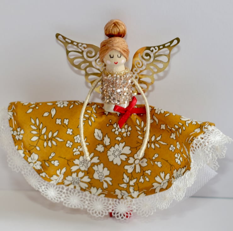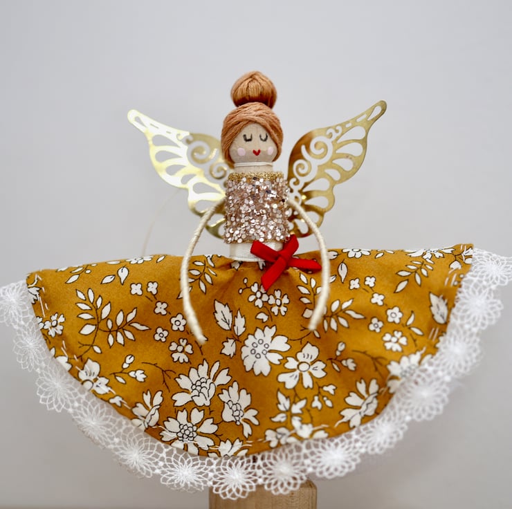Hand painted shoes and face on the peg, lace trimming on the skirt, sparkly bodice with ribbon and bow attachment.