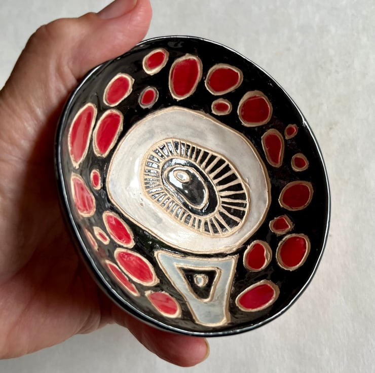 Cute and colourful little ceramic bowl. Handmade by me Jane Walters-Morris (JWM). A perfect pop of colour for your side table! Fully glazed so you could put nuts, seeds or even chocolates in if you wish. Looks gorgeous just left empty though or even as a place for your earrings. 9.5cm x 9.5cm approx. All my pieces are one offs although they are usually in a family group of three similar designs. They're numbered and logged and won't be repeated.