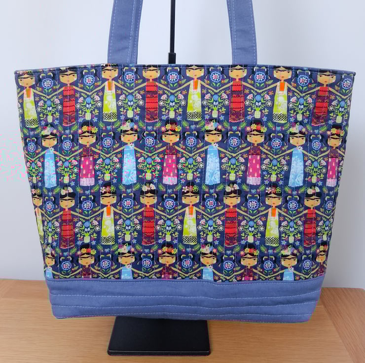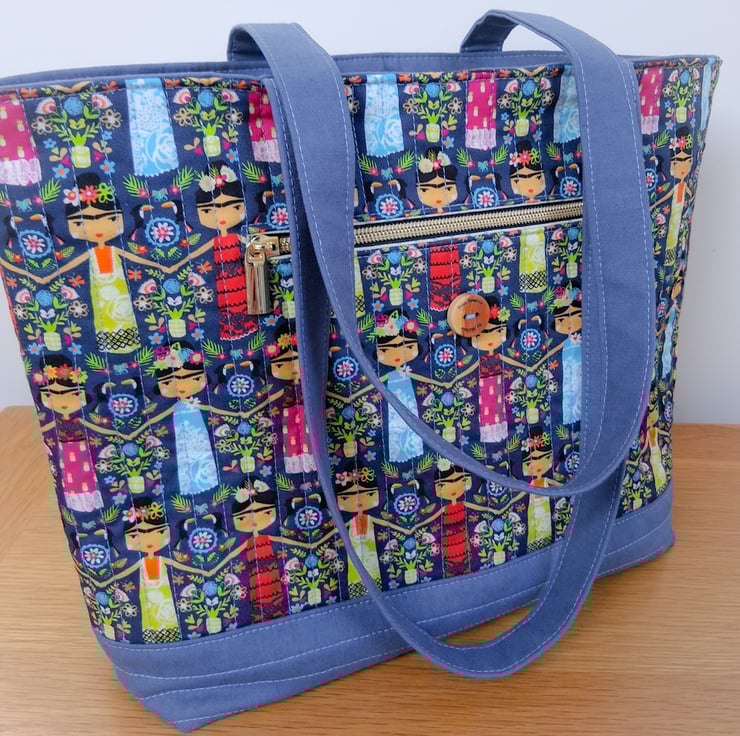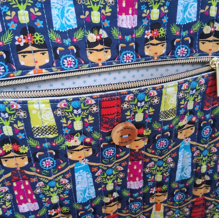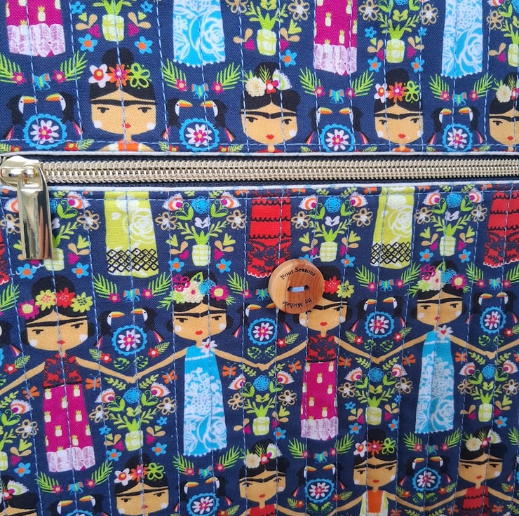 The exterior of this bag is a lovely 100% cotton printed fabric called Viva La Vida, by Stephanie Thannhauser for Dashwood. It features a vibrant and cute design of Mexican ladies. I have quilted it with straight lines and inserted a zipped pocket into the front panel. This has a matching dark blue zip with gold teeth. I have also added a polished yew button which is my brand label.