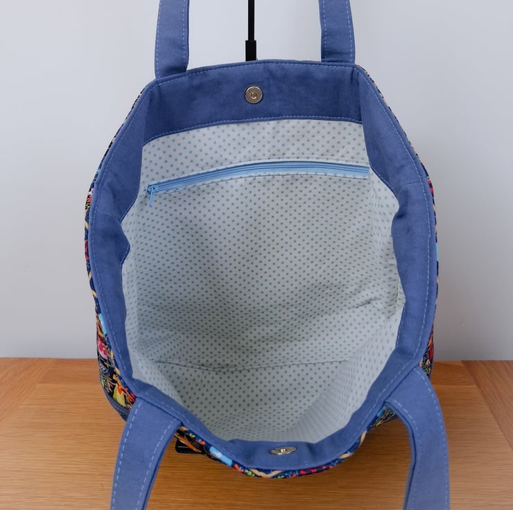 I have inserted a zipped pocket with a light blue zip. The bag closes with a gold coloured magnetic snap.
