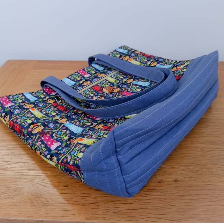 I have sewn a layer of wadding inside the bag to add structure and softness and have quilted the base section and topstitched the handles and seams.