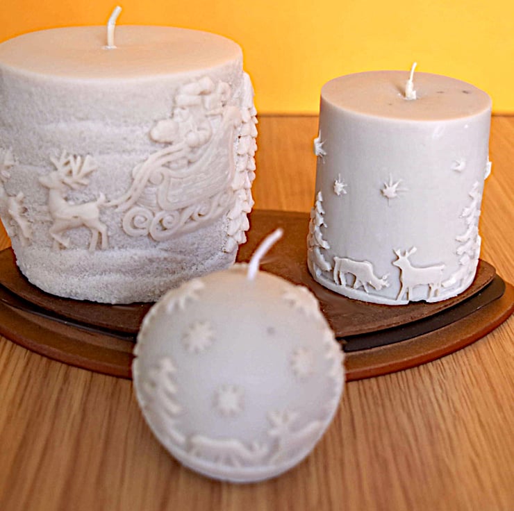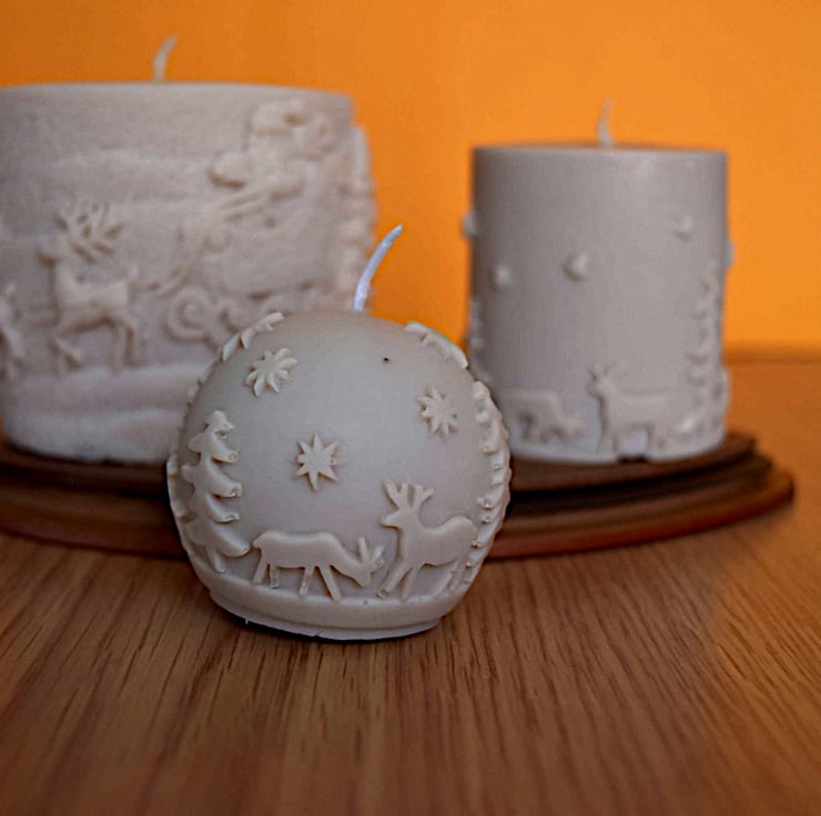 Three candles with beautiful scenes on them, that smell devine of a crisp pepperminty fresh scent of Candy Canes, The larger pillar measures 7 cm high, 7cm wide weighing 307g; the med pillar measures 6cm high & 5.5cm wide weighing 118g; the ball scene candle measures 4.8cm high, 5.2cm wide weighing 65g.