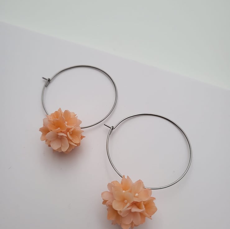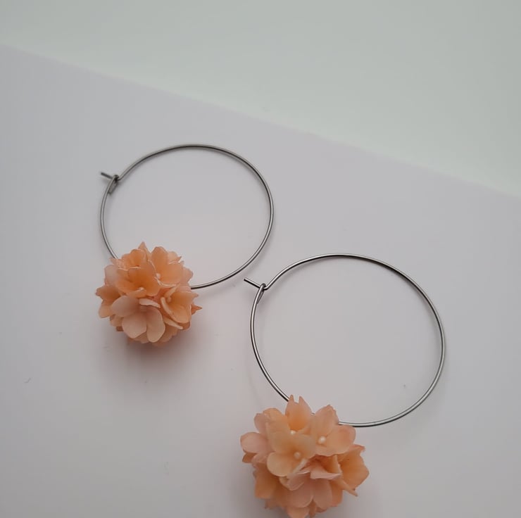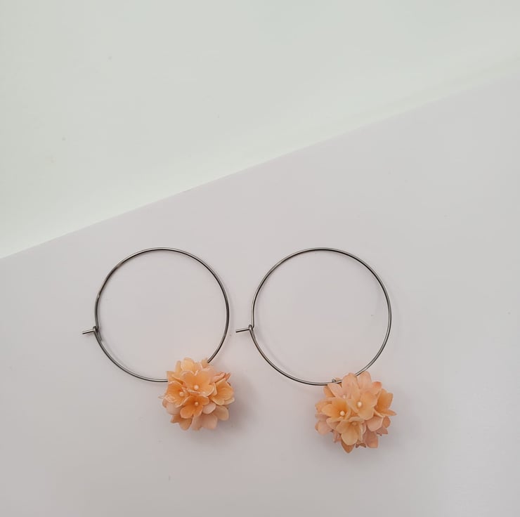 Exquisite and charming, these earrings feature delicate, lifelike orange hydrangea flower clusters that dangle gracefully from sleek, modern silver-toned hoops. The soft, peachy hue of the flowers adds a touch of warm elegance, perfect for a romantic evening or a cheerful daytime look. Lightweight and comfortable, these earrings are a beautiful statement piece for any occasion.