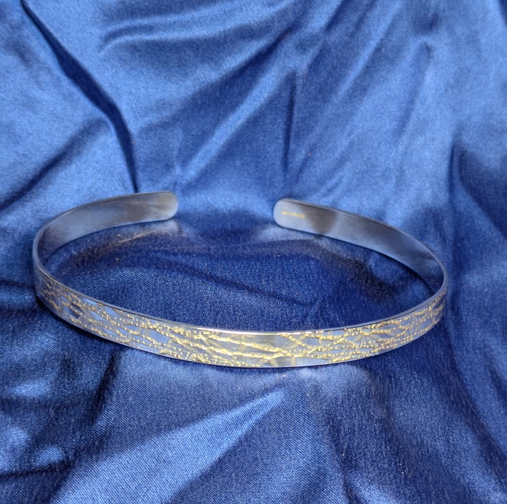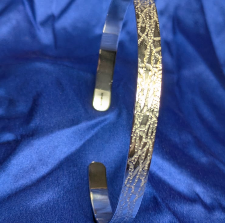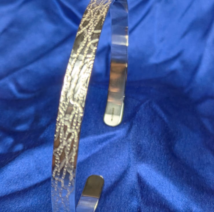 Hallmarked 925 sterling silver bangle made from recycled silver with lace imprint pattern. Perfect for those looking for a unique and fine jewellery piece to elevate their outfit. Made with attention to detail and exquisite craftsmanship, this bangle is 6mm wide and an oval shape 75 mm x 60 mm. Approximately 11g weight. Supplied in satin drawstring pouch.