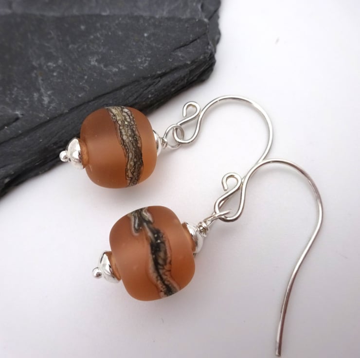 A pair of earrings made with handmade sterling silver earrings, sterling silver beads and handmade lampwork glass beads.