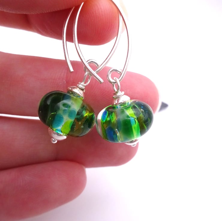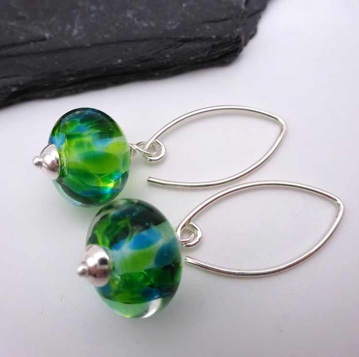 A pair of sterling silver earrings which feature green speckled handmade lampwork glass beads.