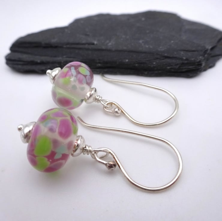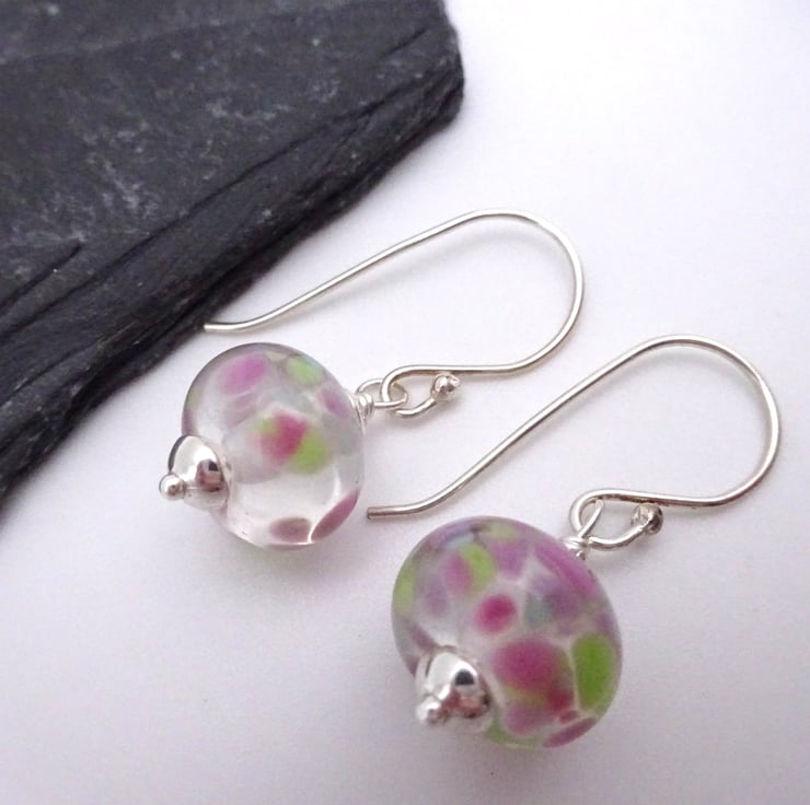 A pair of earrings made with sterling silver ear wires and handmade lampwork clear and pink/purple, green glass beads.