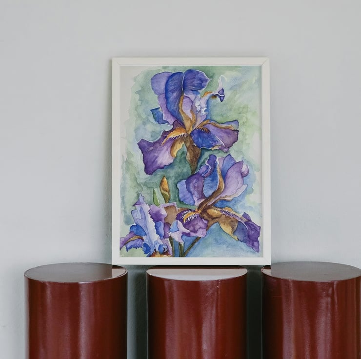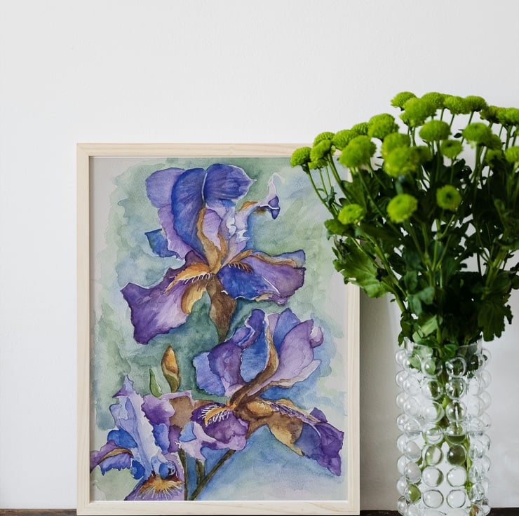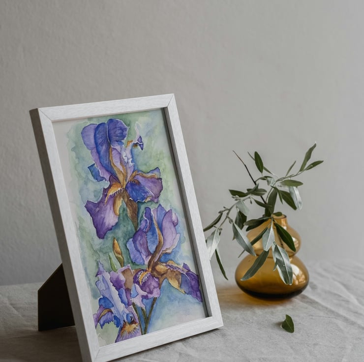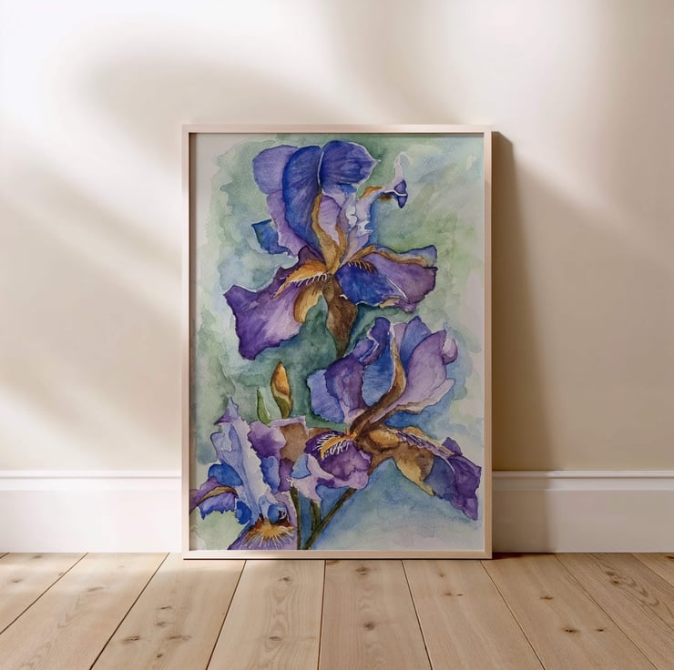 This is an A4 art print of a beautiful flag iris, originally painted in watercolour using soft shades of blue and purple. The delicate floral detail makes it a lovely focal point for any room, whether hung as part of a gallery wall or displayed on its own.