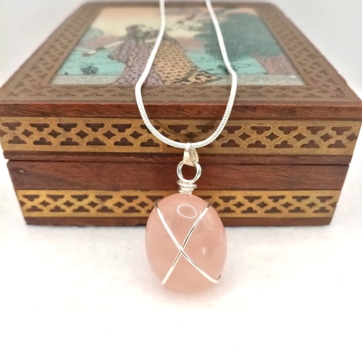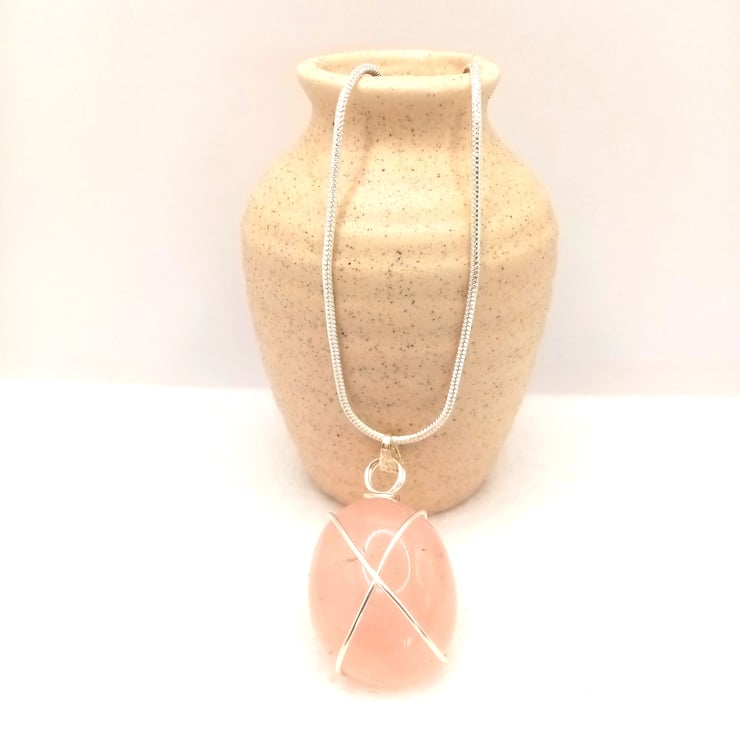 Wire wrapped natural rose quartz tumble stone with silver plated snake chain.