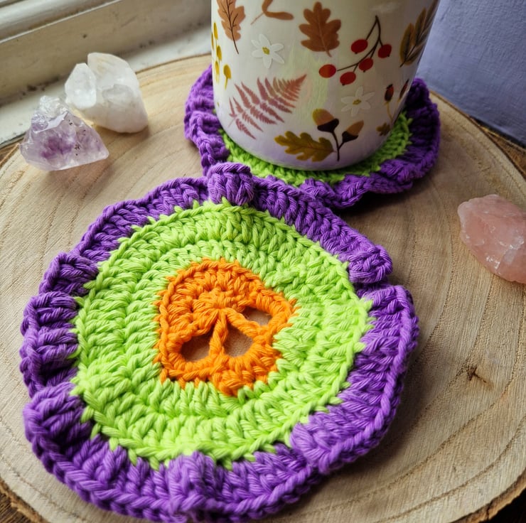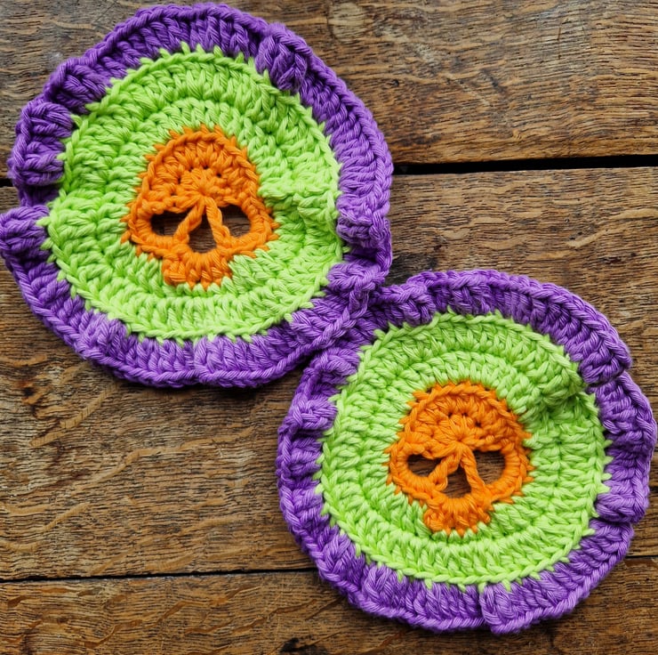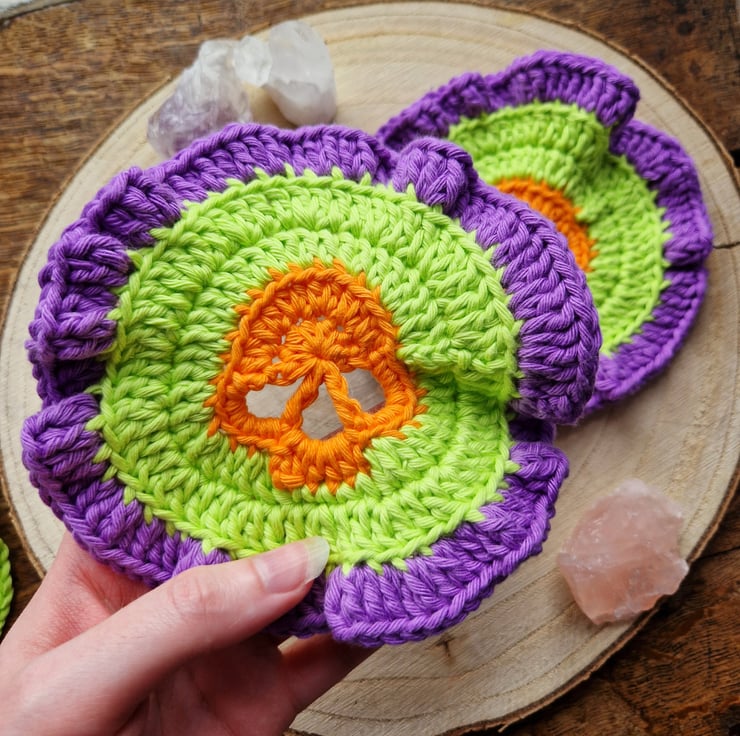 - Each coaster set contains two skull coasters. The coasters measure on average 12cm (4.7 inches) by 12cm (4.7 inches). They have an orange skull centre, a neon green inner circle and purple frill.