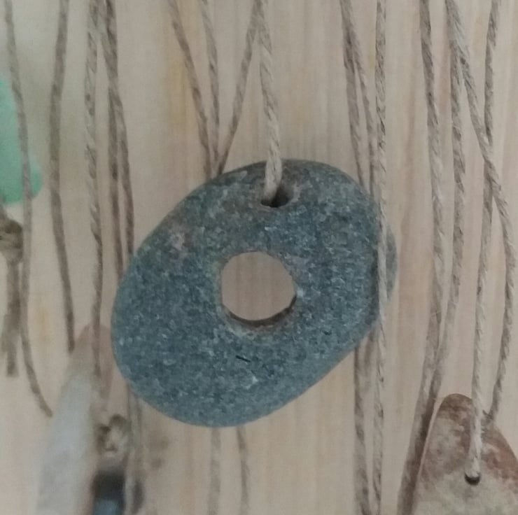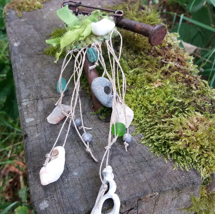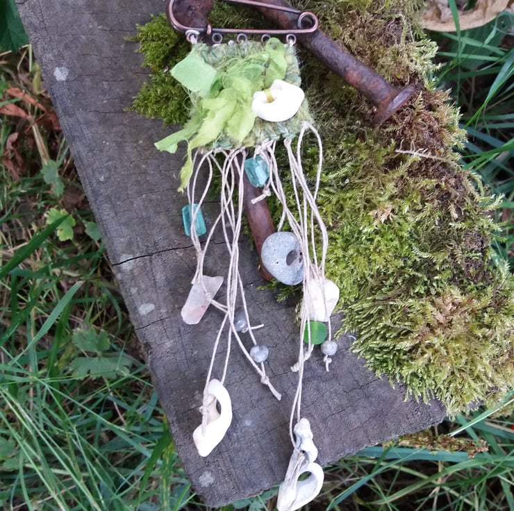 Hand dyed and woven brooch, kilt pin attachement, with beach found treasures hanging down including shells and a Hag Stone, with silk interwoven in the design. Pin width 5cm, overall length 17 1/2cm