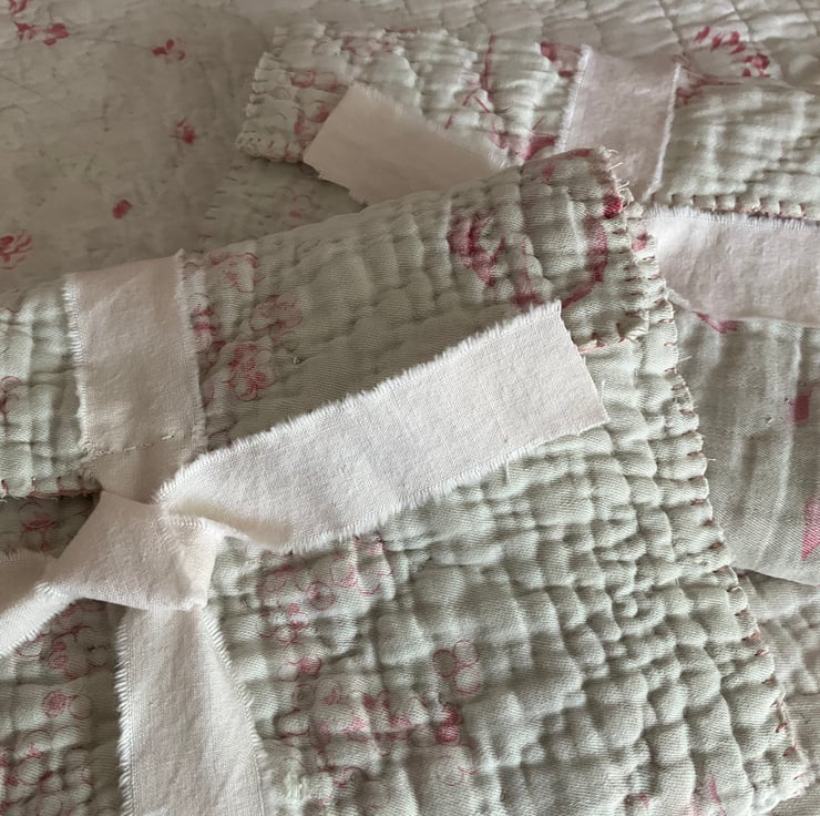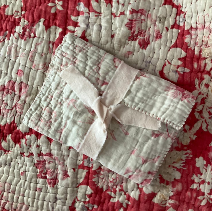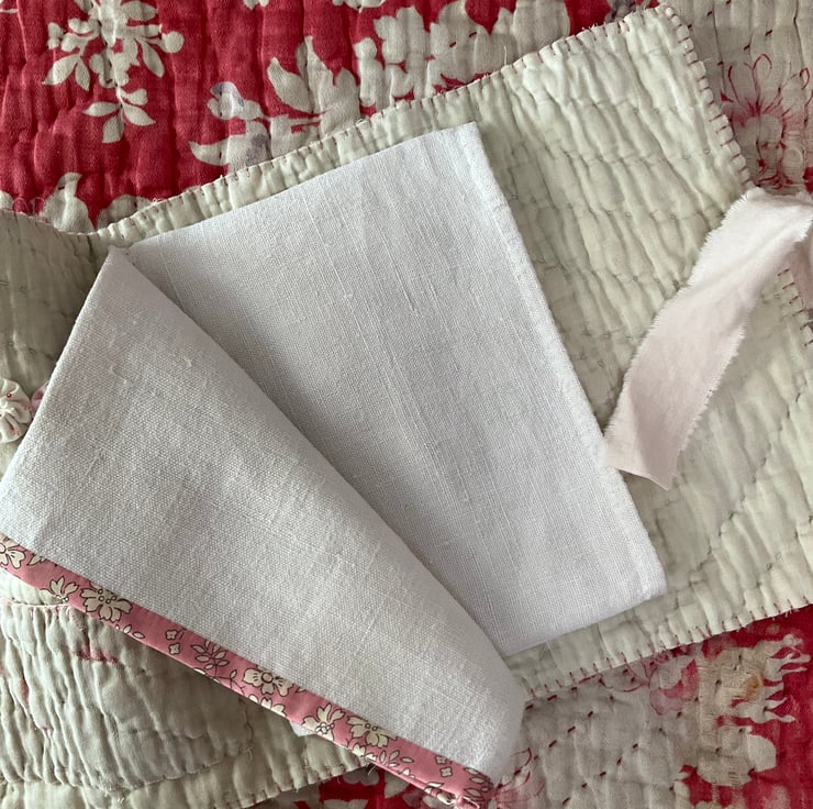 The whole folder fastens with a length of hand dyed tied linen, in a soft pale pink.