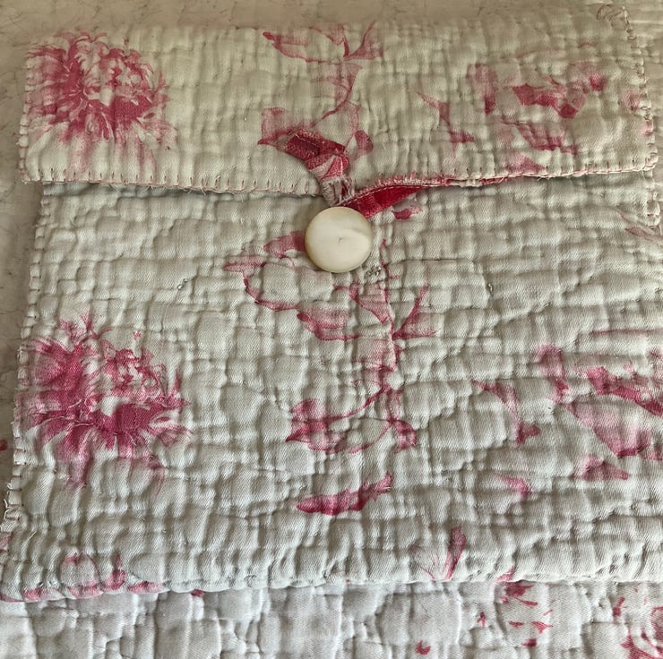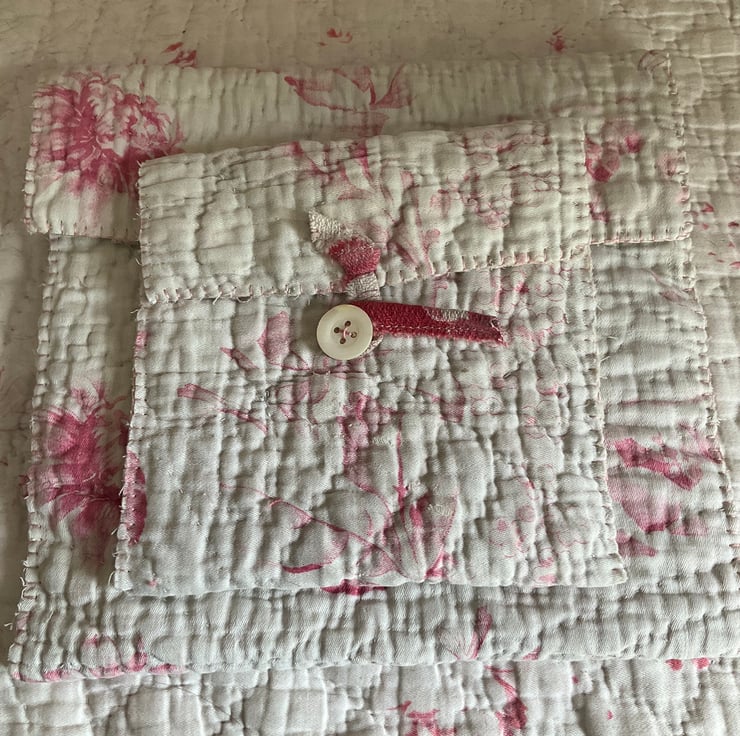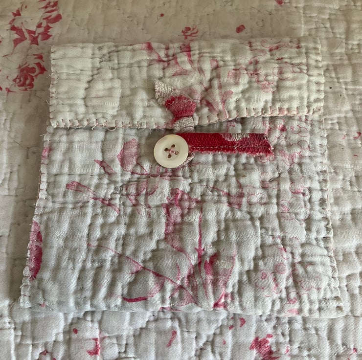 The pocket and pouch is edged with blanket stitch. The pouches fasten with a vintage ivory button and a printed fabric strip. Just secure by wrapping the fabric strip around the button.