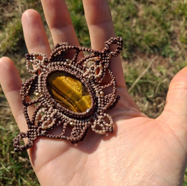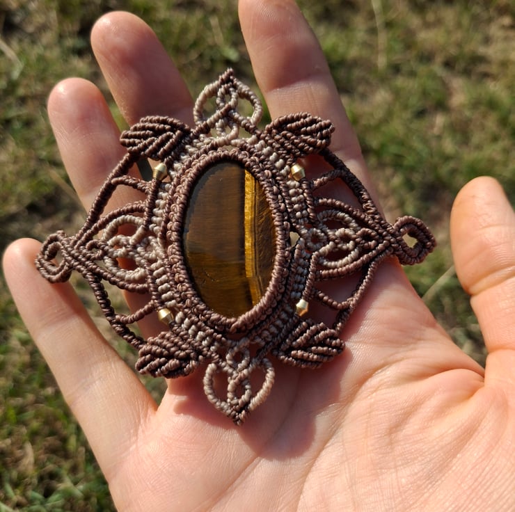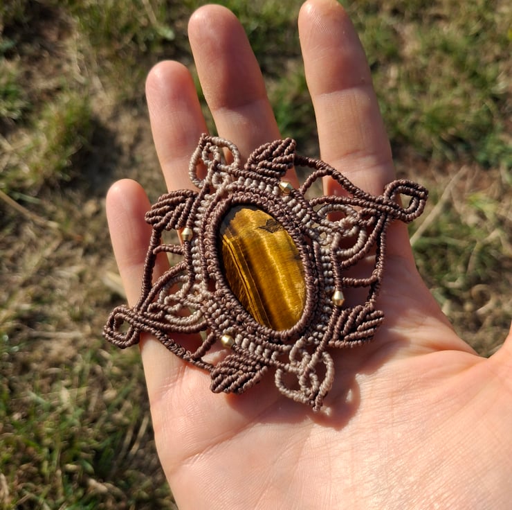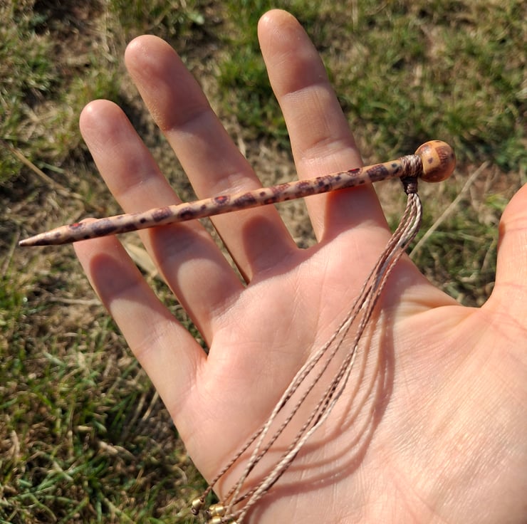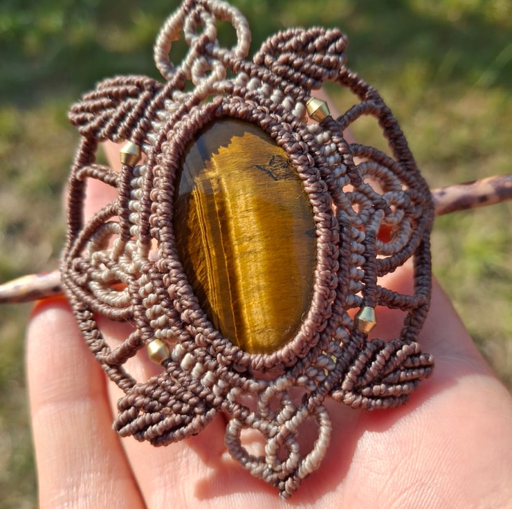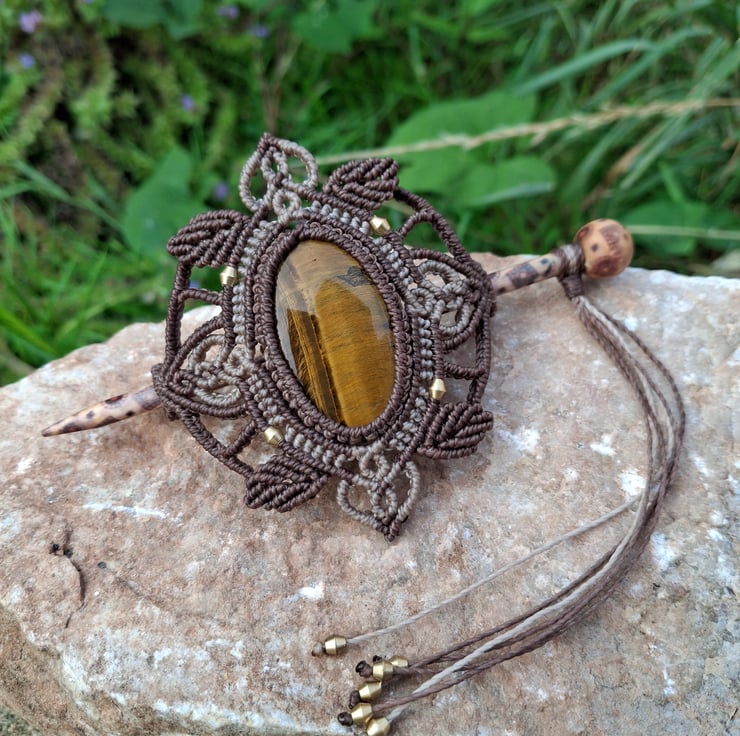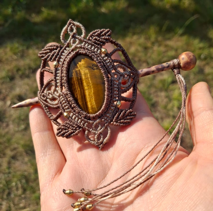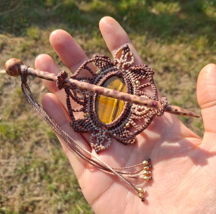 Hair barette made with a good quality cord and brass beads. The wooden hair stick measures approximately 13cm. The barette measures approximately 8.2cm in length and 10.5cm in width. Will be sent via Royal Mail, tracked.