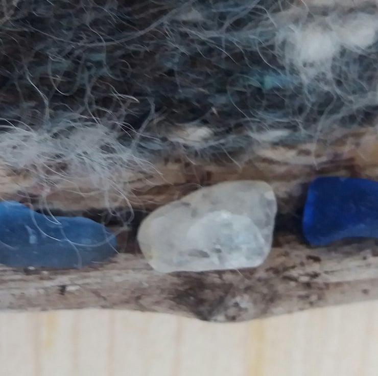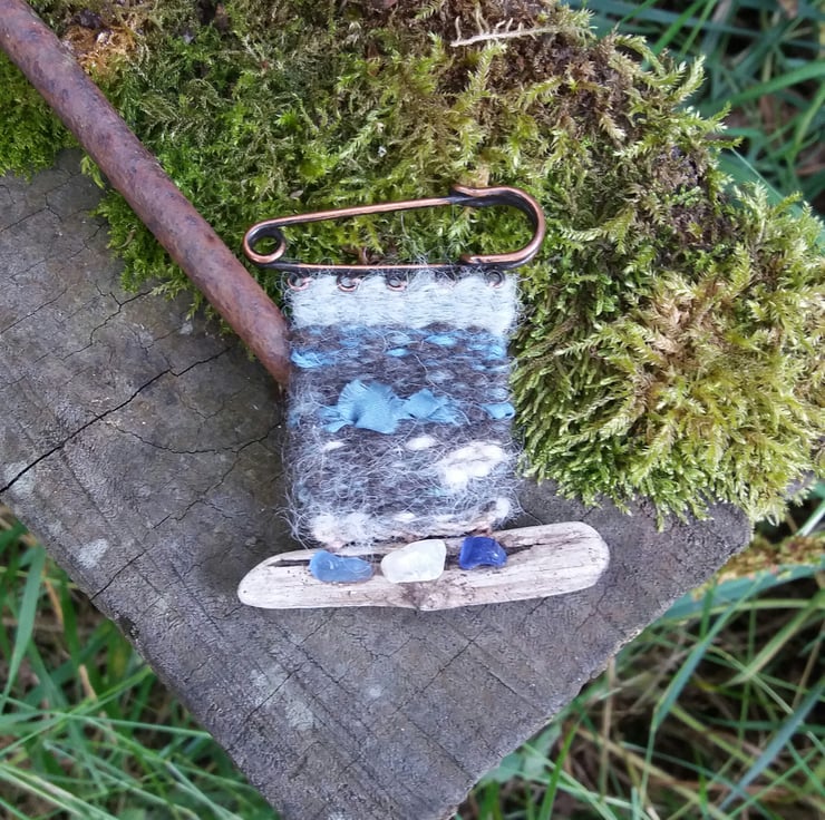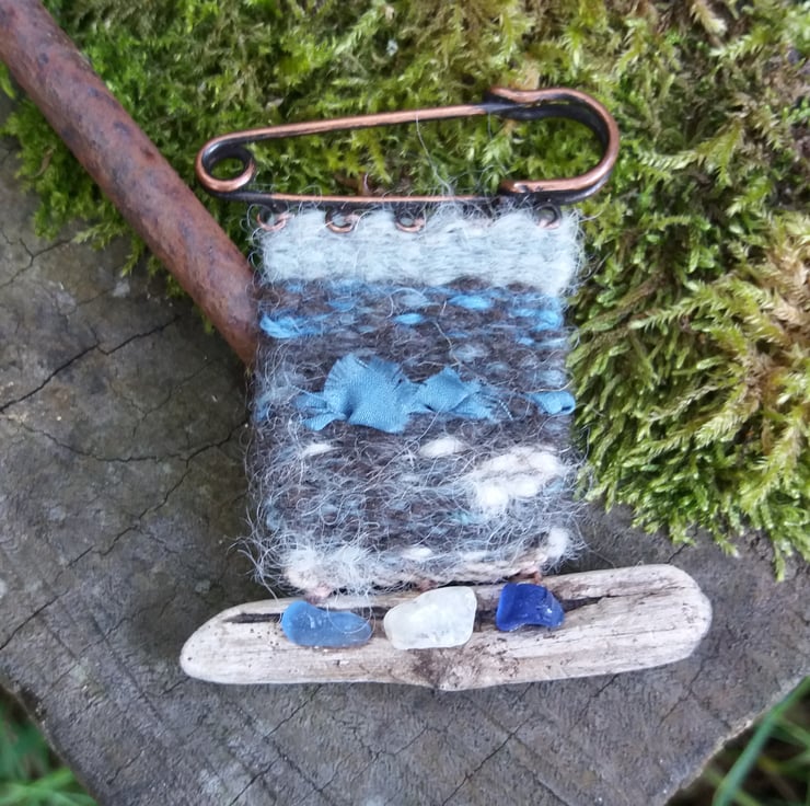 Handwoven and dyed brooch with silk inclusions, with seaglass and driftwood found on the seashore. Pin width 5cm, driftwood width 6cm, overall length 7cm