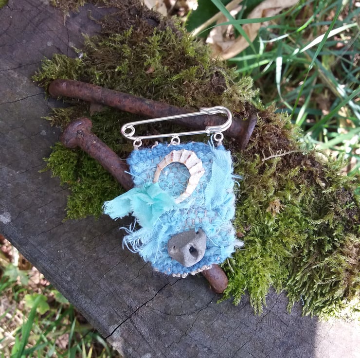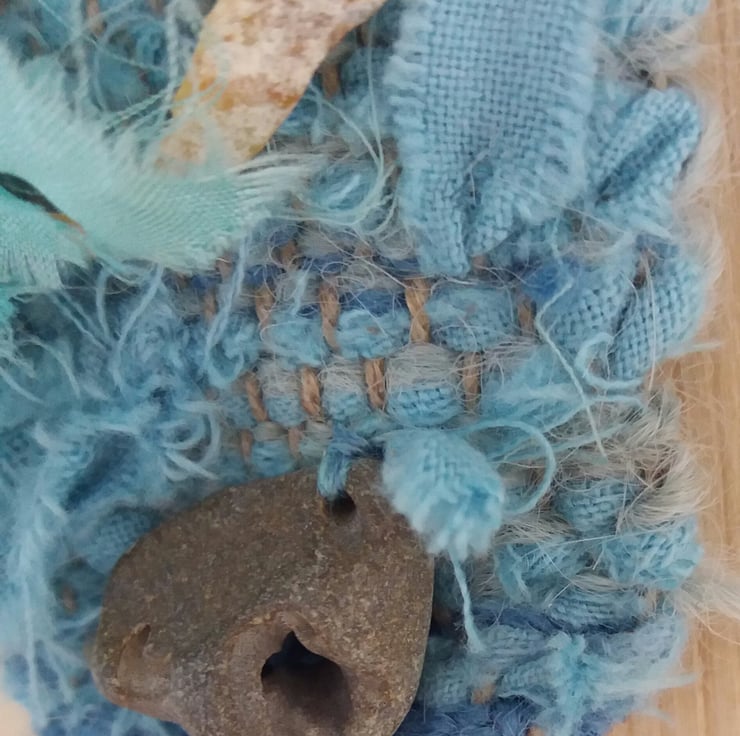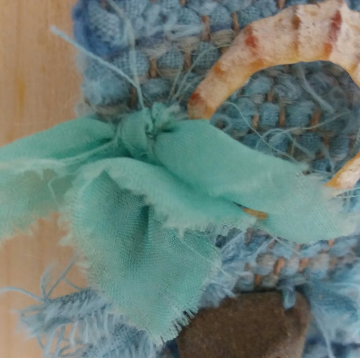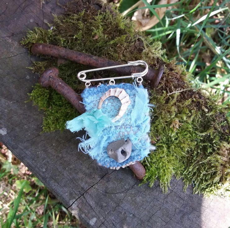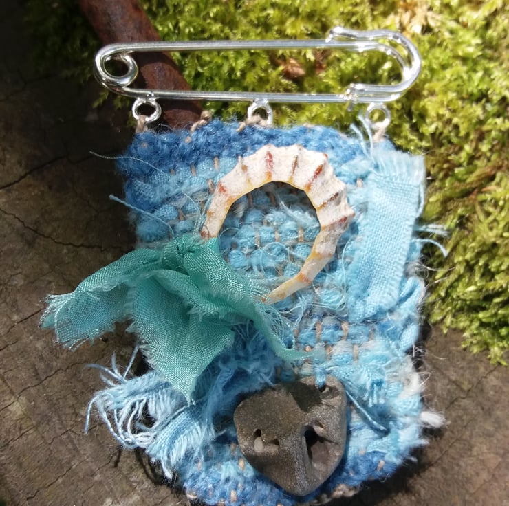 Hand dyed and woven, brooch on kilt pin, with shell and hag stone, and silk.
