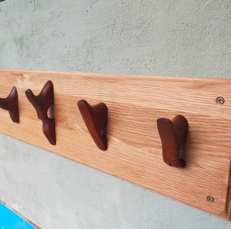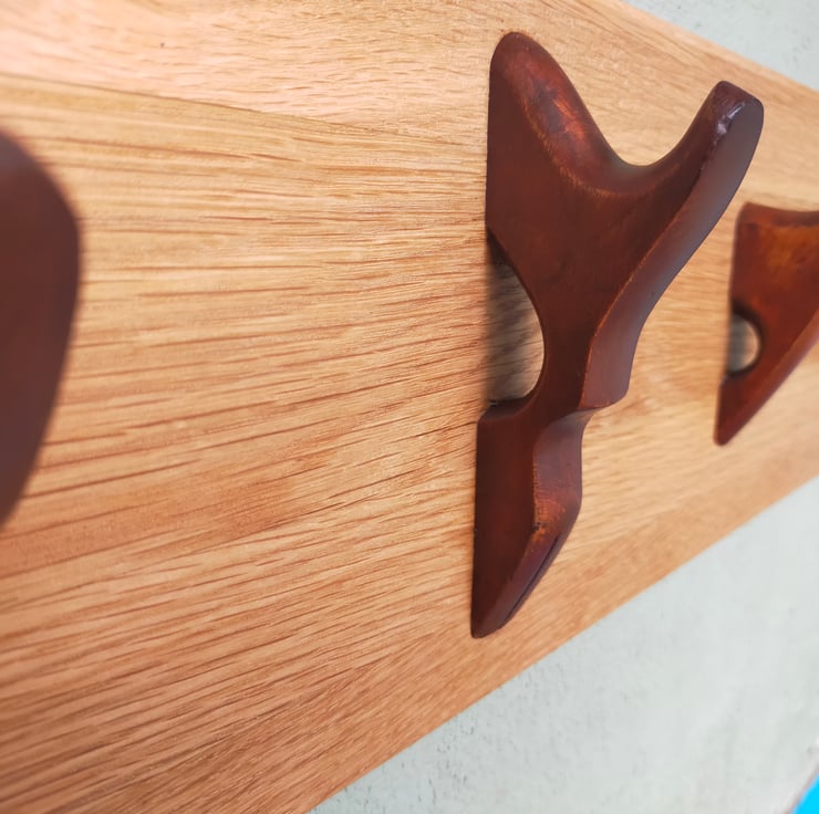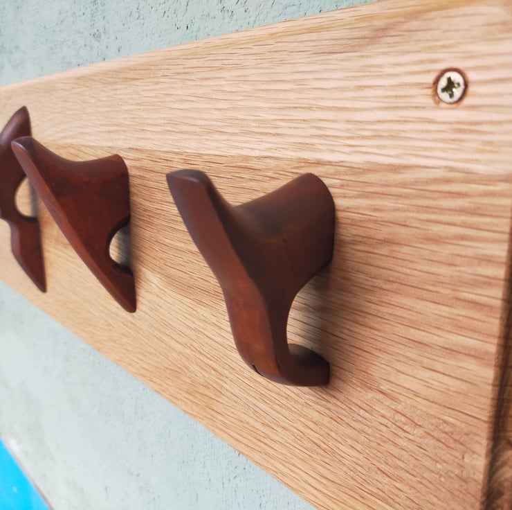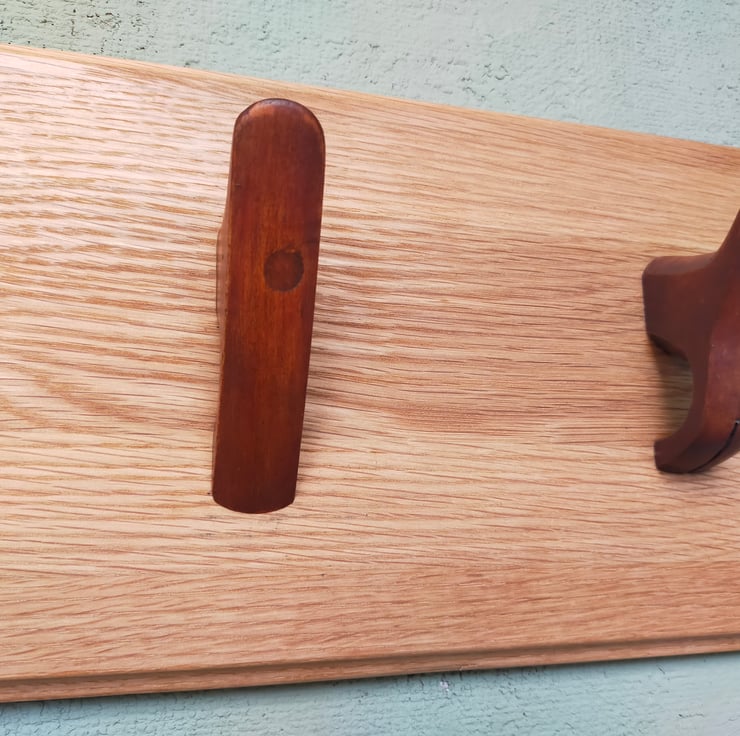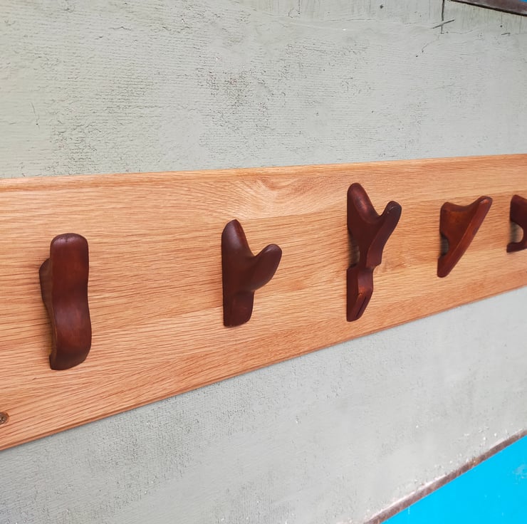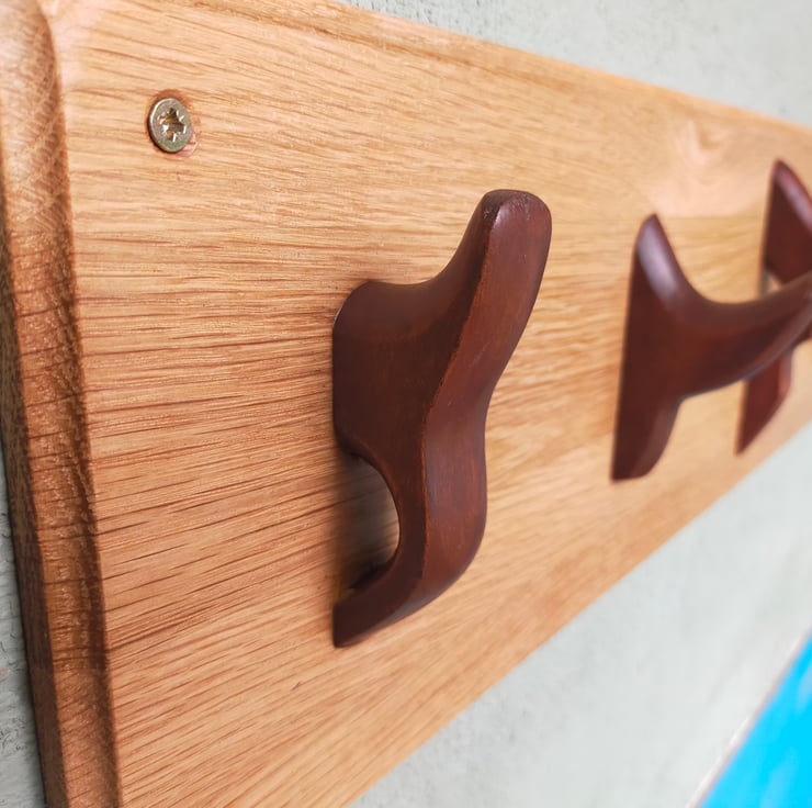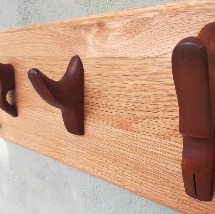 For many years I have been on the lookout for old saws at boot sales and sometimes in charity shops. Often the blades are beyond saving and go into the recycling but the handles are a thing of beauty, with their beautifully crafted sculptural shapes. Originally I chose to leave the handles as found, all different colours, scuffed and often paint-splattered, but they just looked too messy, and detracted from the shape of the wood. So I stripped and sanded and stained to create something slightly less authentic but prettier (in my eyes). The handles are beech and are securely screwed and glued to the backboards which are glued oak panels, originally the top of an extendable oak table, and finished in clear wax.