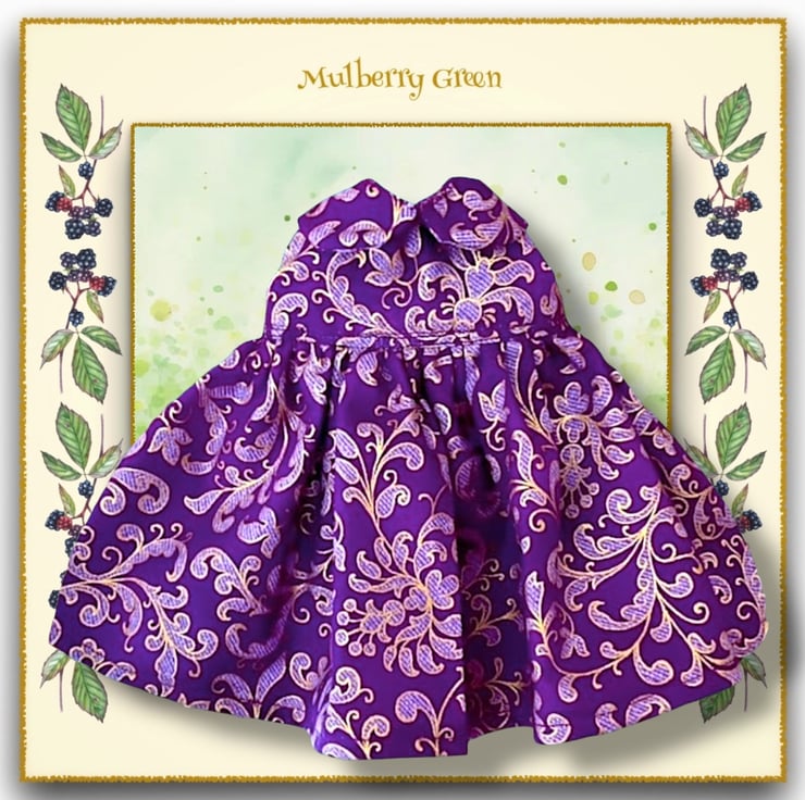 A beautiful little dress in a magenta and gold scroll print, to fit the Mulberry Green characters. The dress is made from best quality cotton and has a lined bodice and a Peter Pan collar.