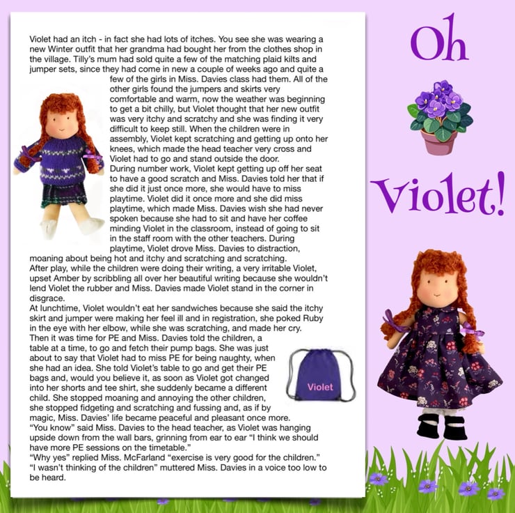 There are other children in Maisy’s class at school - Violet, Billy with his pet rabbit, Amber, Tilly, Rosie and her kittens, Amelia, Ruby, Marigold, Bobby with Max the dog, and the twins Oliver and Olivia, who have a puppy called Oscar. The dolls are all 26cm tall and baby Daisy is 16cm. Maisy and Mo love nothing more than having adventures with their friends. You can read about their adventures on my Facebook and Instagram pages - Maisy Muffin Rag Dolls and on my Mulberry Green Pinterest boards.
