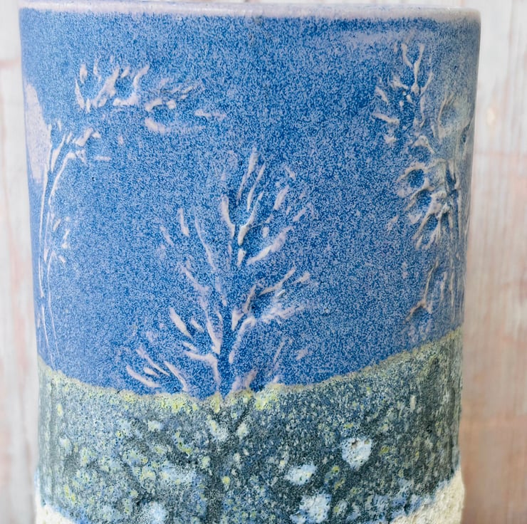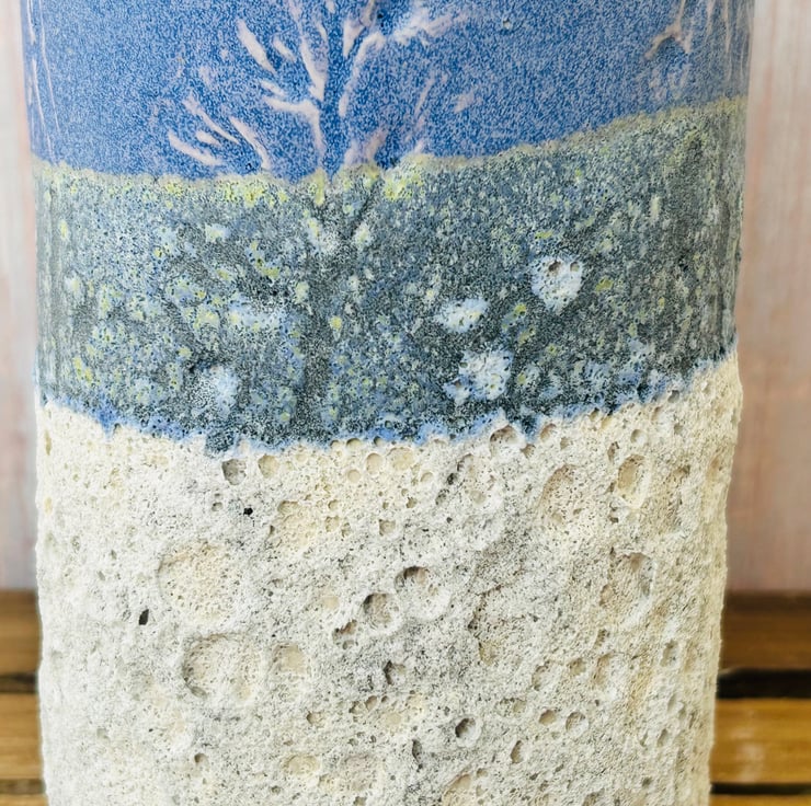 Original pressed with bluebells, I wasn’t happy with the impression. Thought I’d glaze over it but the top glaze still picked out some of the bluebell pattern.