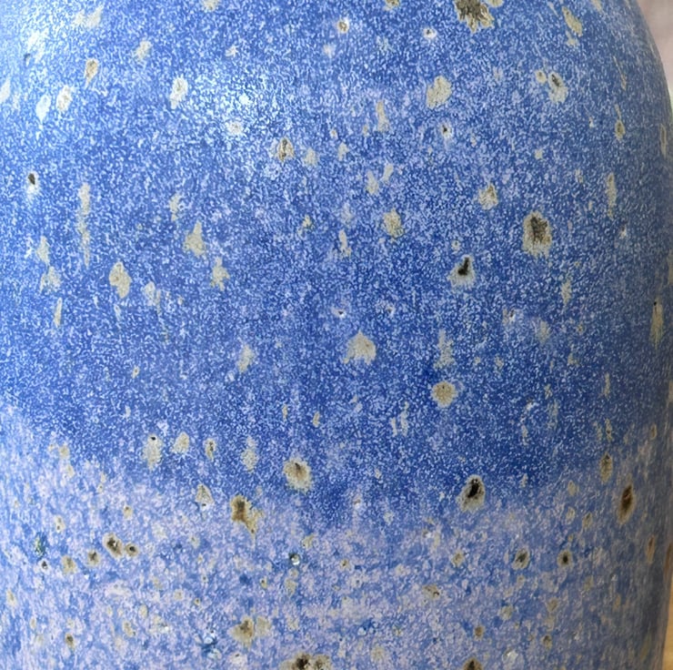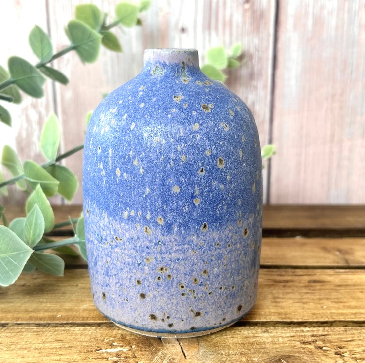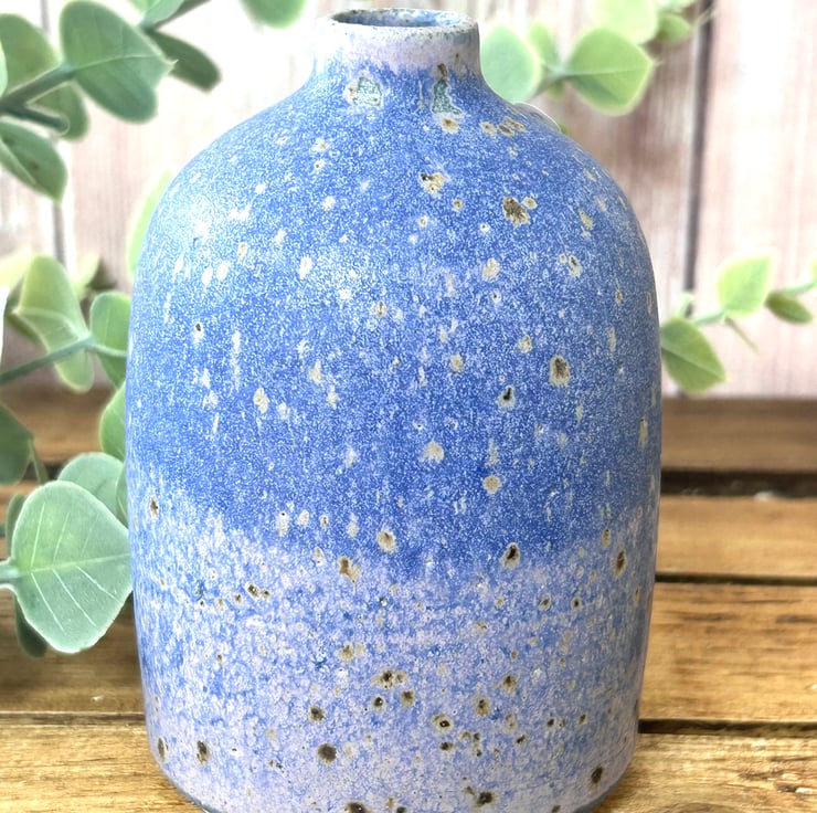 Beautiful hand thrown vase finished in a blue/lavender glaze. Made using a speckled clay, you can see the speckles through the coat. It’s beautiful.
