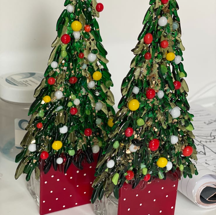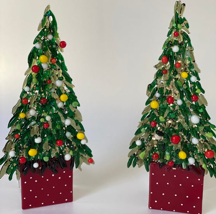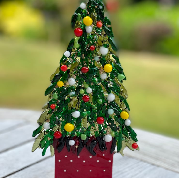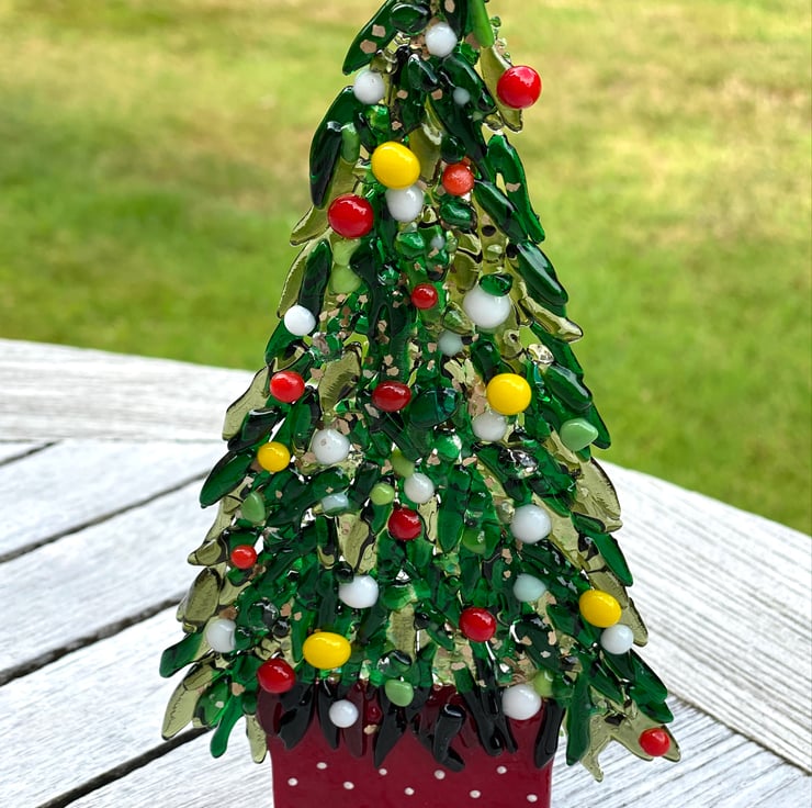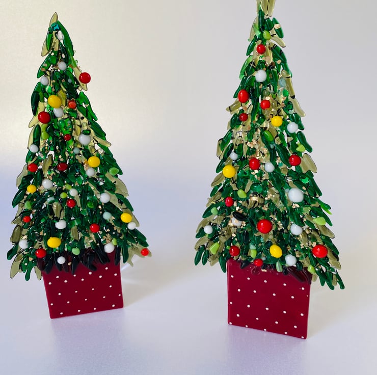 Each of the leaves is cut by hand using a mosaic cutters and twice fusing in the kiln . All of the coloured baubles are fused separately. They take a long time to make But give a beautiful finish which reflects the light. . There are just two available in this size..