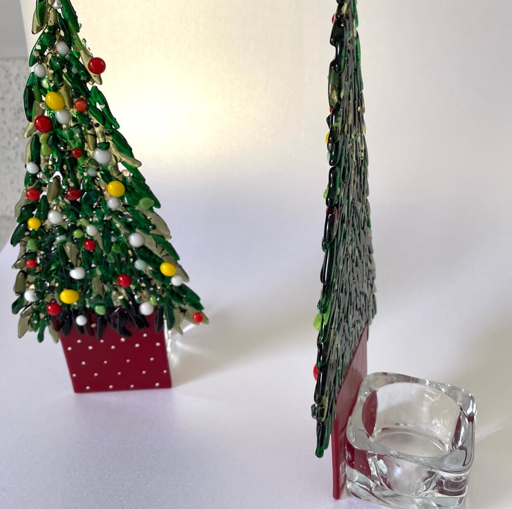 This gorgeous contoured Christmas tree duals as a unique Christmas decoration and a candle holder for nighttime interest . It stands proudly at just over 9 inches .