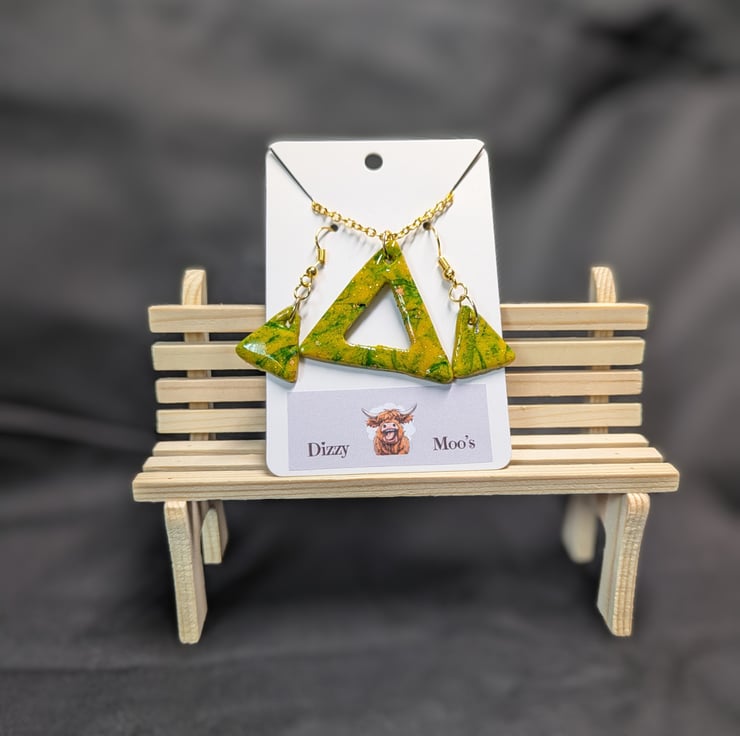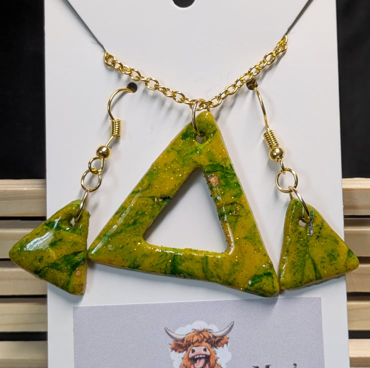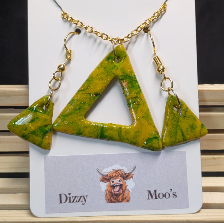A gorgeous jewellery set off triangular earrings and a holed triangle necklace pendant. Made with glittery yellow polymer clay, green paint and copper foil flakes, using a marble effect. I have finished these pieces off with an all over resin coating.