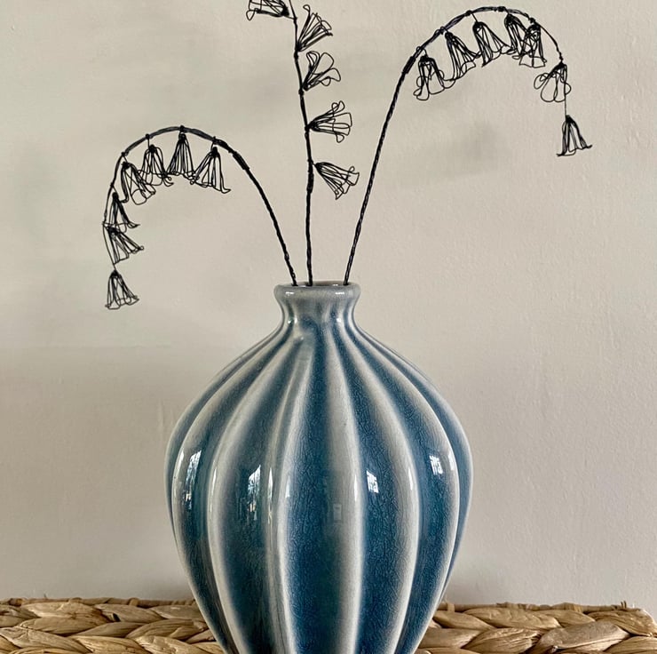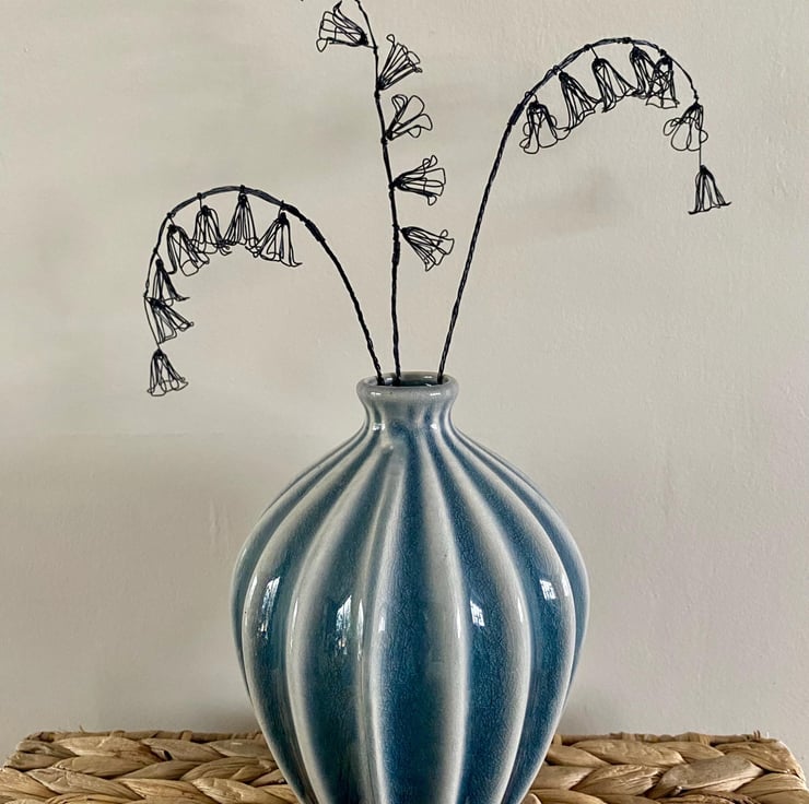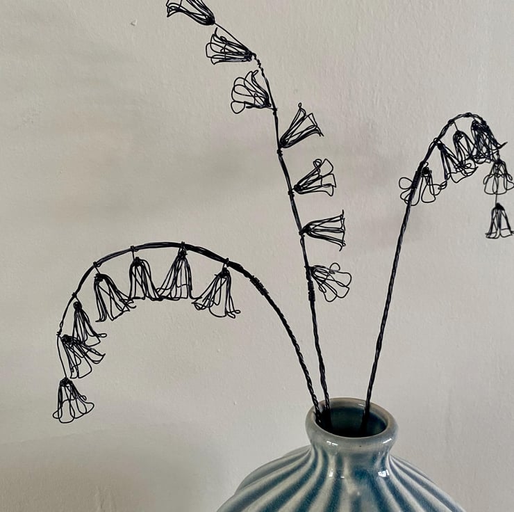 A delicately handcrafted wire posy of three bluebells stems. The stems can be easily bent to display an arched or upright look. The stems will be posted in an upright position- please see video for bending them