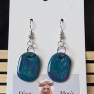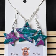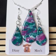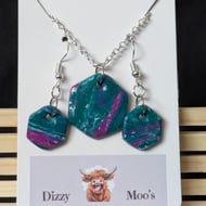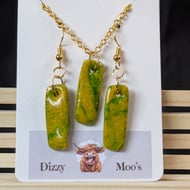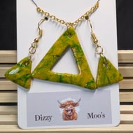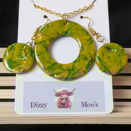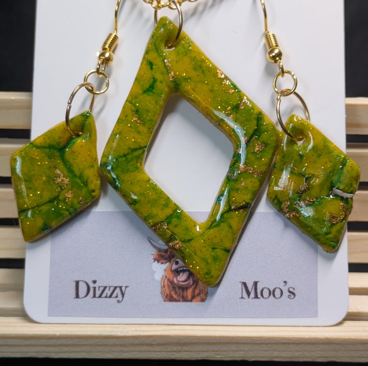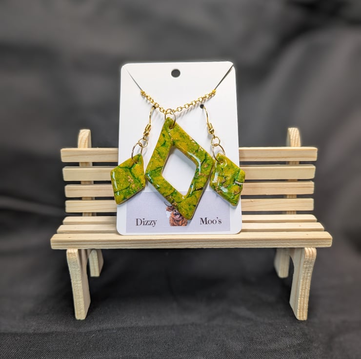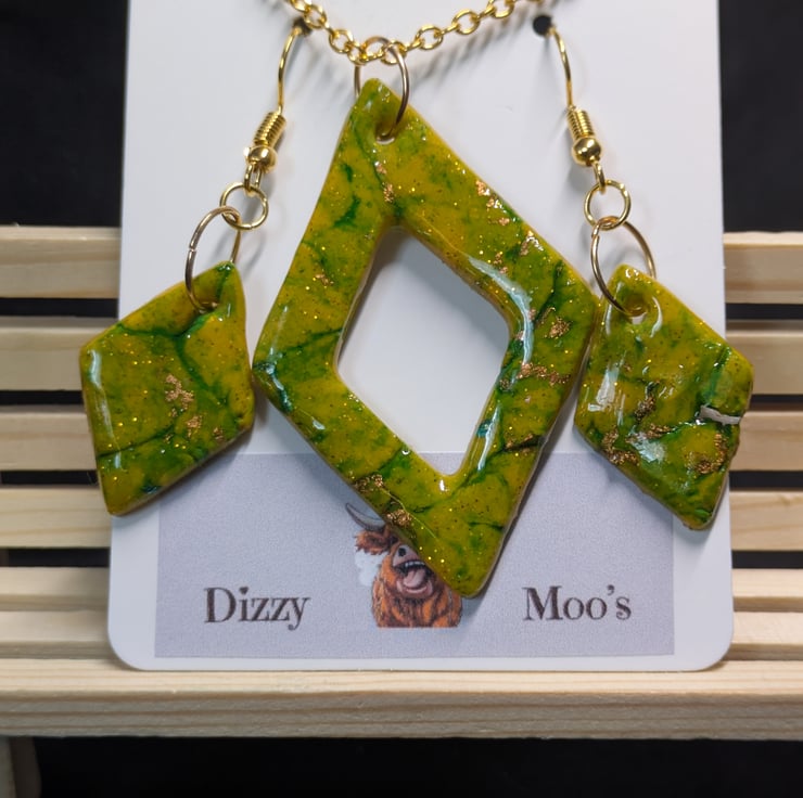 The set consists of an apertured diamond pendant and smaller solid diamond earrings. They are made with glittery yellow polymer clay, green paint and some copper foil flakes in a marbled effect. I have finished the pieces off with an all over resin coating. This piece in particular has some cracks and holes, done on purpose, I love them!!!!