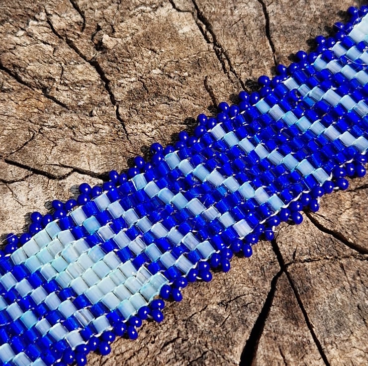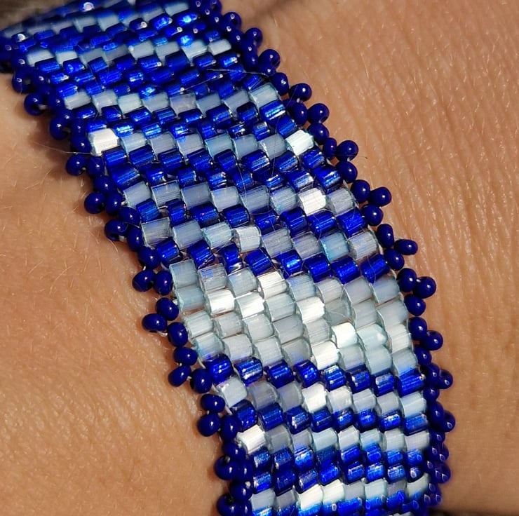 Made with shimmering beads in a blue diagonal striped pattern with a blue picot bead edge.