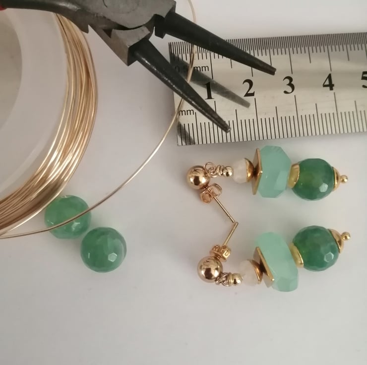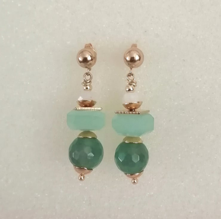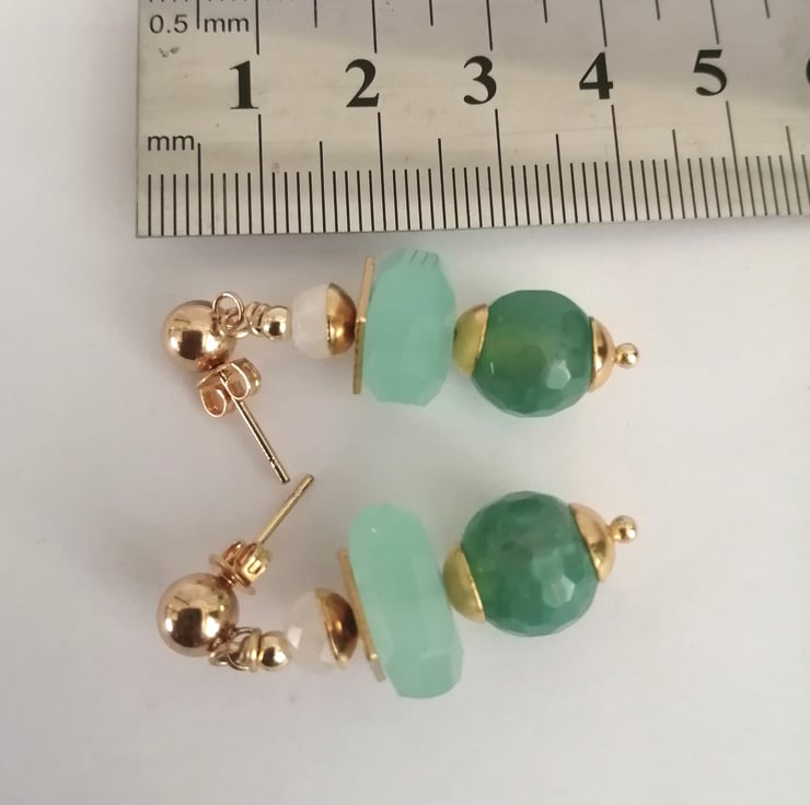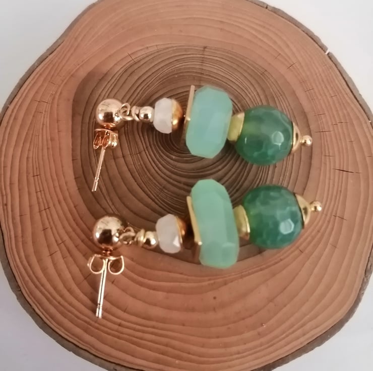I designed these earrings around the vibrant, sea green chalcedony tumble faceted beads, mixing shapes and sizes. With faceted moonstone and agate gemstones.