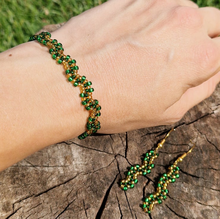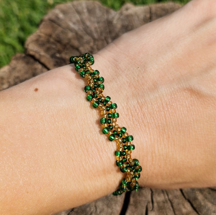 This sleek and chic wavy gold beaded bracelet with green accent beads has been lovingly and mindfully created with shimmering gold seed beads and forest green beads. The bracelet is adjustable, with a gold plated clasp and extender chain.