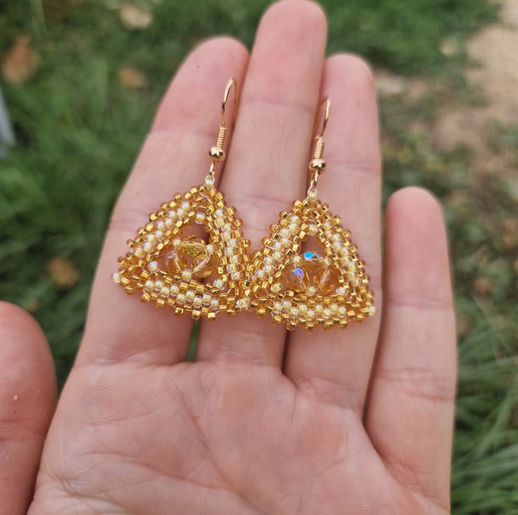 Each pair of triangle earrings is handcrafted with precision using high-quality gold and stunning pale yellow seed beads, gold faceted glittering beads, and are finished with gold-plated ear wires for a polished look.