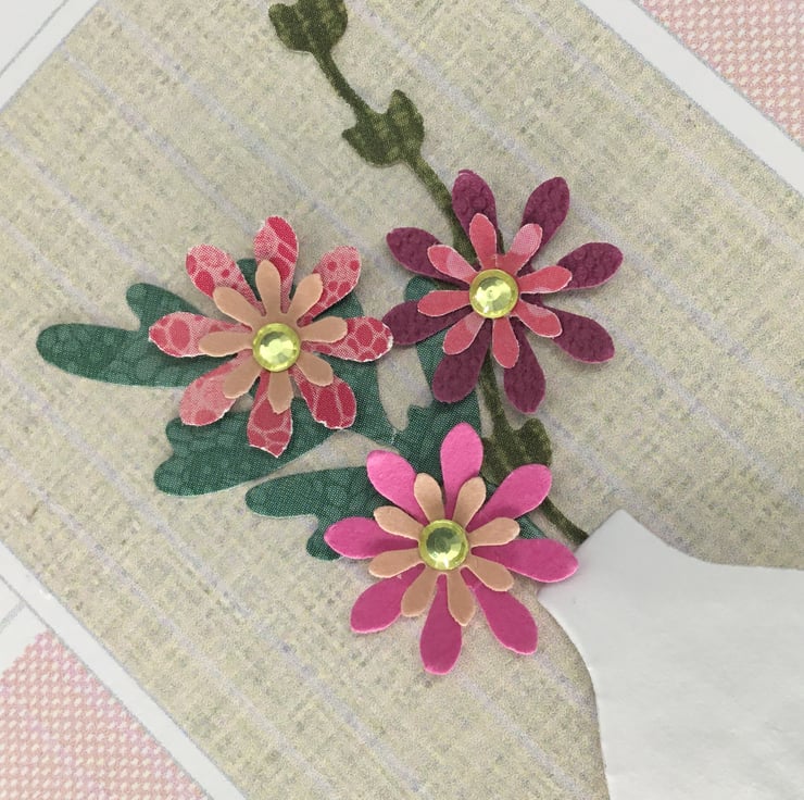 A handmade card featuring a hand die cut vase of flowers. The flowers and foliage are cut from various plain, patterned and textured papers and card. The flowers consist of two layers each, embellished with pastel green coloured adhesive gems. The vase is cut from 300gsm white card which has been shaped and mounted on foam pads to give the card more dimension.