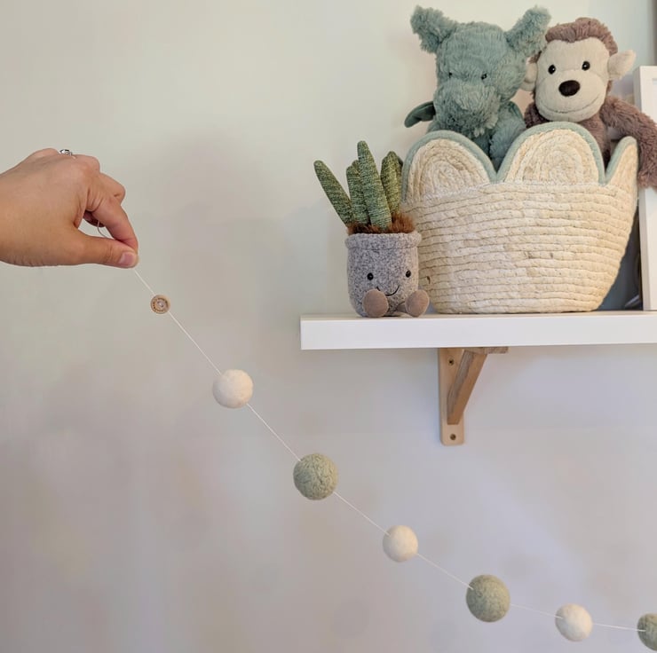 Add a touch of natural charm and cosy texture to your space with this handcrafted needle felted wool ball garland. Lovingly made in my home in Ilkley, Yorkshire, this soft and minimal garland is perfect for a baby’s nursery, child’s bedroom, or any room in need of a subtle pop of colour and warmth.