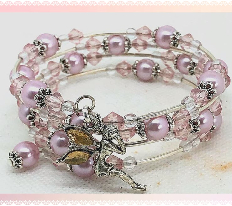 Created using stainless steel memory wire I’ve added silver plated spacers, bead caps, pretty pink faux pearls & a rhinestoned winged Fairy. Nickel free. Wrapped around the wrist
