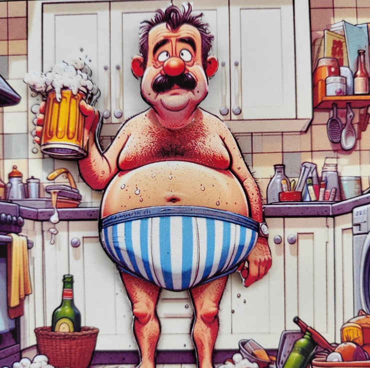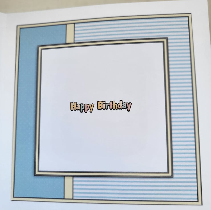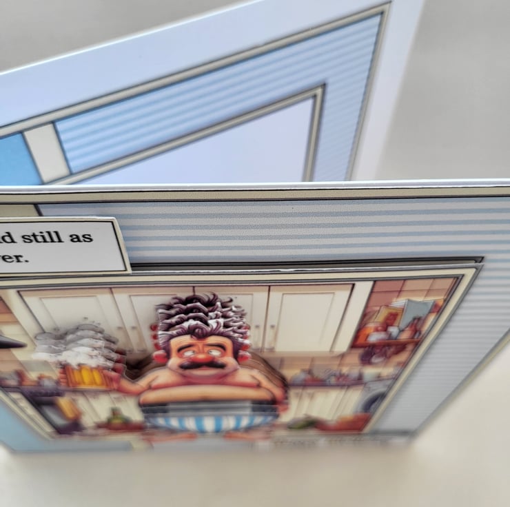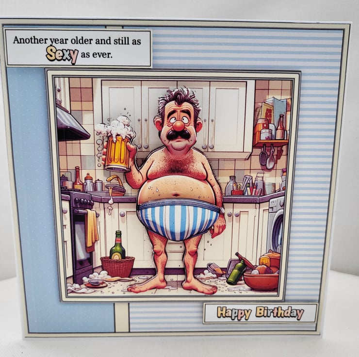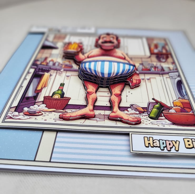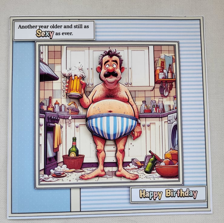 This humorous card measures approx 7x7 inches. I have printed it onto good quality pro print card, then hand cut each element out and then layered them up using foam tape to create depth and dimension. I can if you prefer do the insert blank. Please message me if this is your preference.