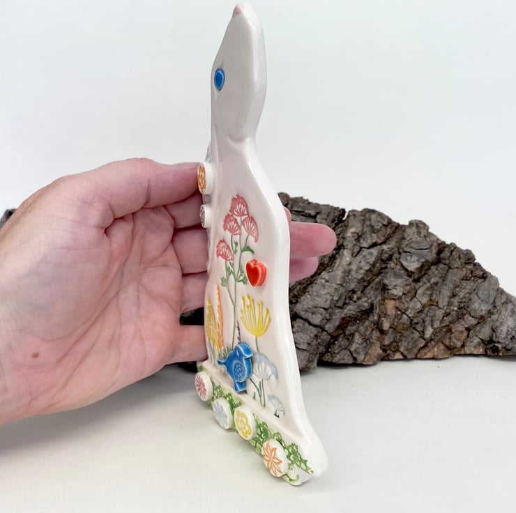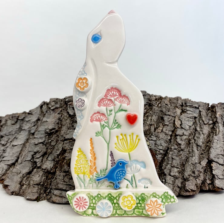 This moongazing hare decoration has been made from white earthenware clay and decorated with pattern and raised features. It has been fired twice and finished with a clear, glossy glaze. Glazed on the front only. It measures 16.5cm x 8.5cm x 1cm deep and has a metal hanging loop on the back.