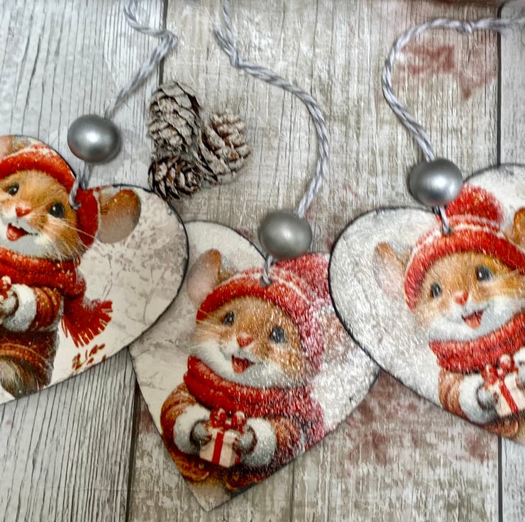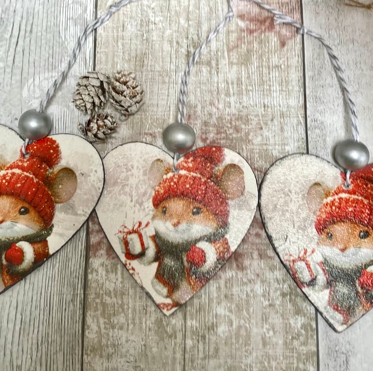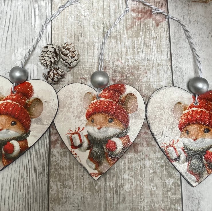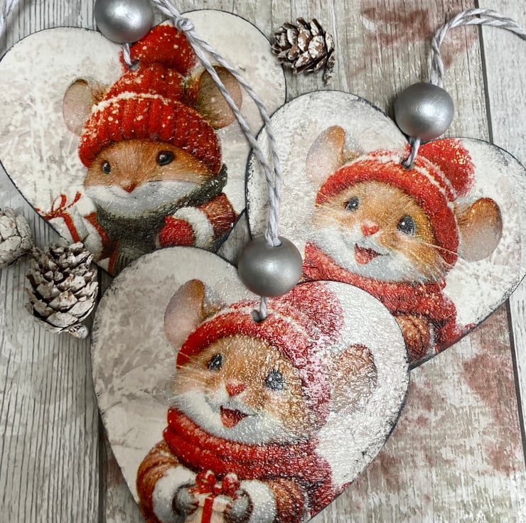 Add a touch of festive whimsy to your home with this adorable Christmas Mouse hanging heart. Each wooden heart is handcrafted and decorated with charming Christmas mice designs — perfect for your tree, mantel, or wall. These folksy, rustic-style decorations bring warmth and cheer to any space and make delightful stocking fillers, Secret Santa gifts, or handmade keepsakes for the holiday season.