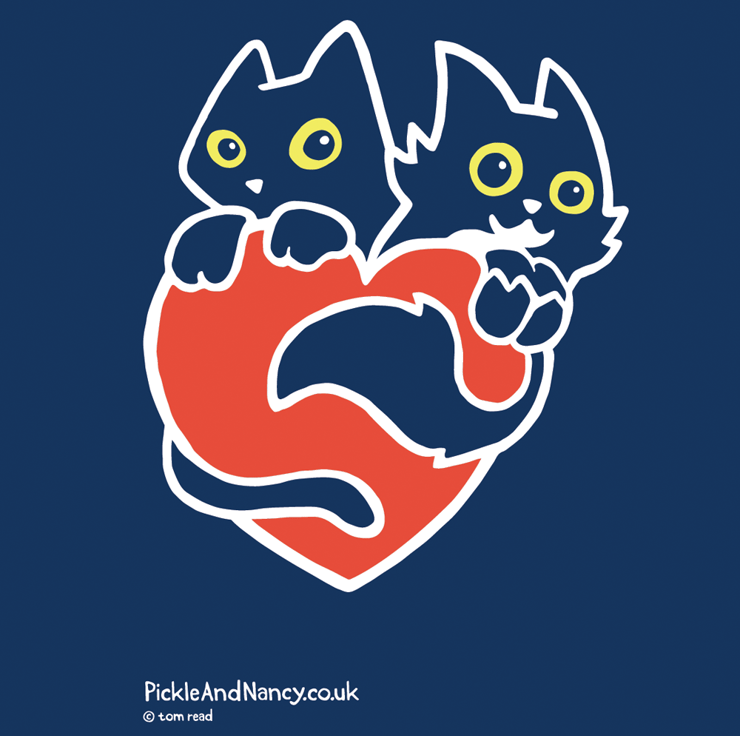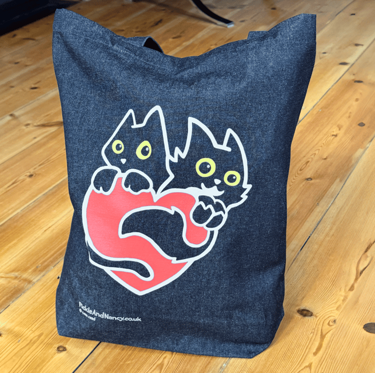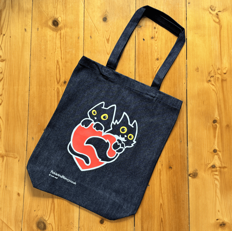 A classic denim tote bag featuring a bold three-colour screen print of two black cats around a large red heart. Designed and printed in the UK, this stylish and sustainable bag is made in a Fairtrade & GOTS certified factory.