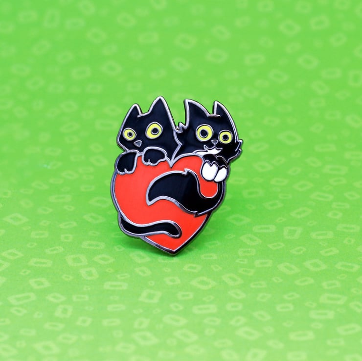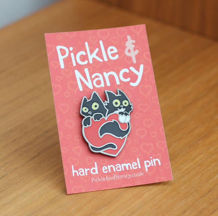 Two black cats, one red heart – a beautifully detailed hard enamel pin that celebrates love and feline friendship. Based on our real-life cats Pickle and Nancy, this sweet pin is a charming gift for cat-loving friends or partners.