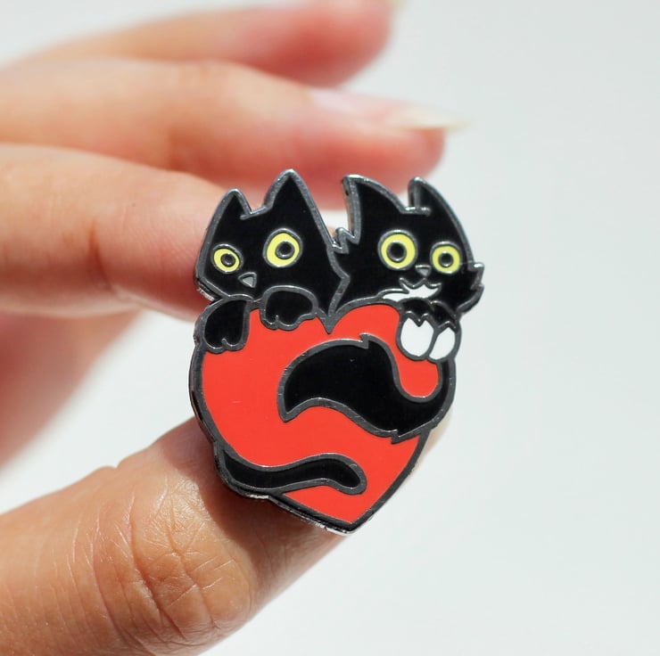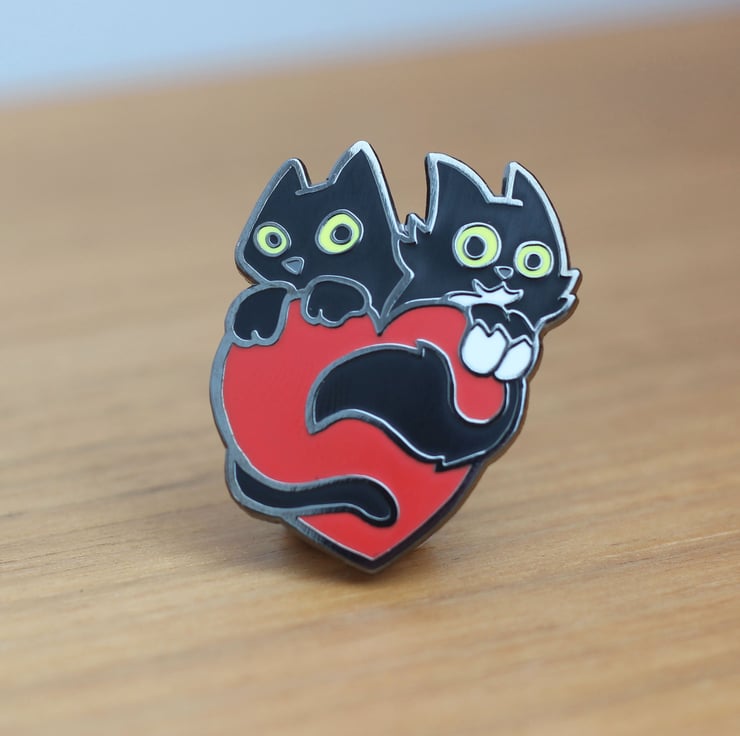 Black cats with red loveheart hard enamel pin, Hard enamel pin with black cats