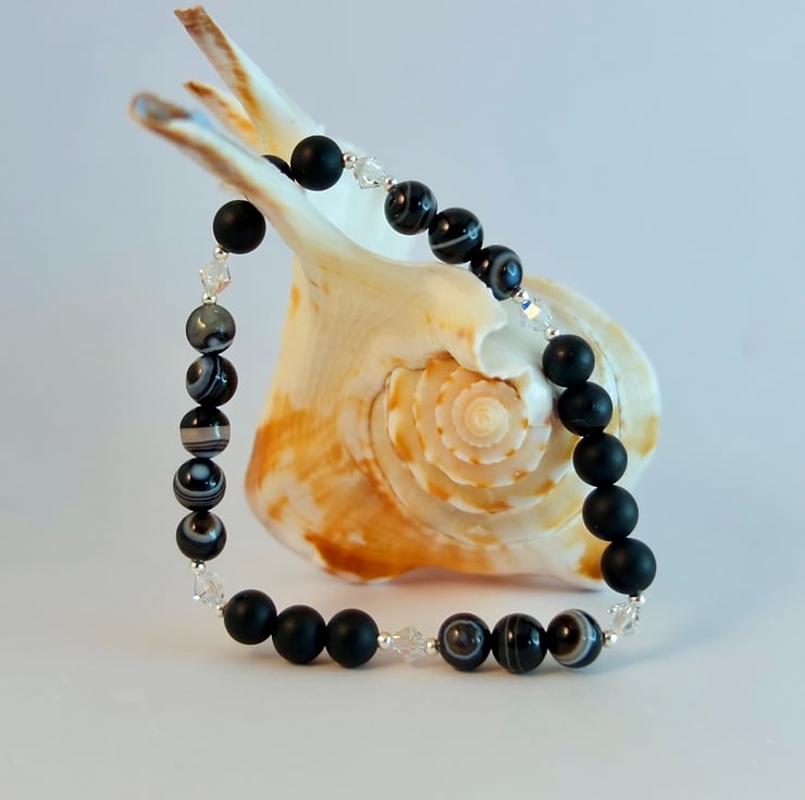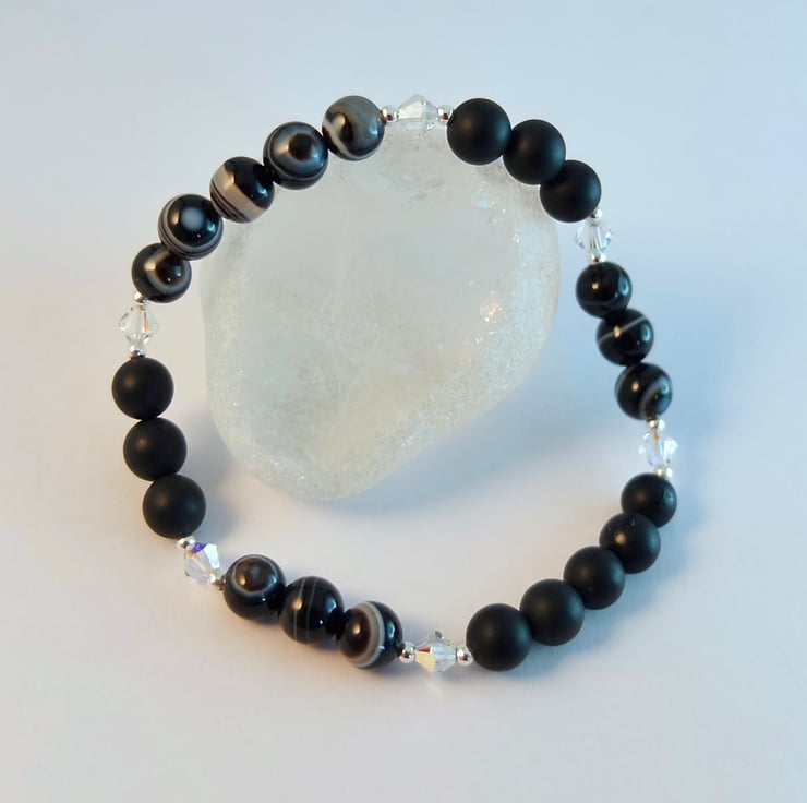 This sparkly monochrome bracelet features 6mm banded Black Onyx and 6mm frosted Black Onyx, embellished with glittering, 4mm, quality Austrian AB crystal bicones highlighted with 2mm sterling silver spacer beads.
