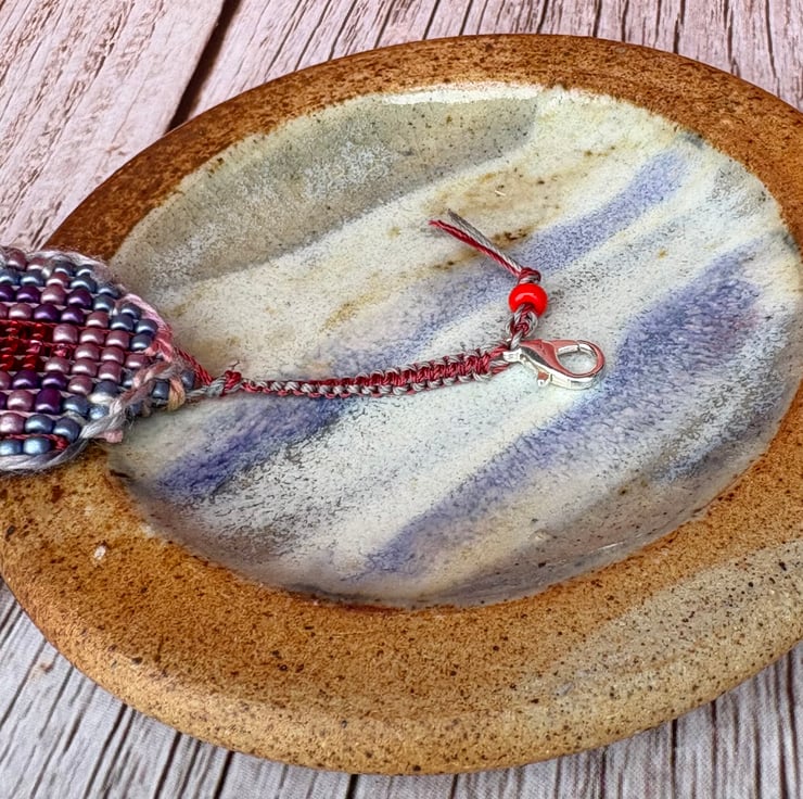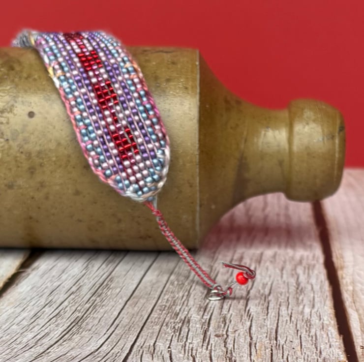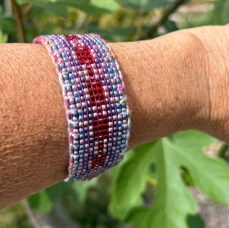 This striking bracelet is hand woven on a bead loom with 11 rows of glass seed beads creating a colourful pattern. The bracelet is finished with a co-ordinating wool felt backing stitched with a silk blanket stitch edging. The centre waxed thread warp strings have been braided at each end using a square knot macrame technique and fastened with a lobster claw clasp and ring.